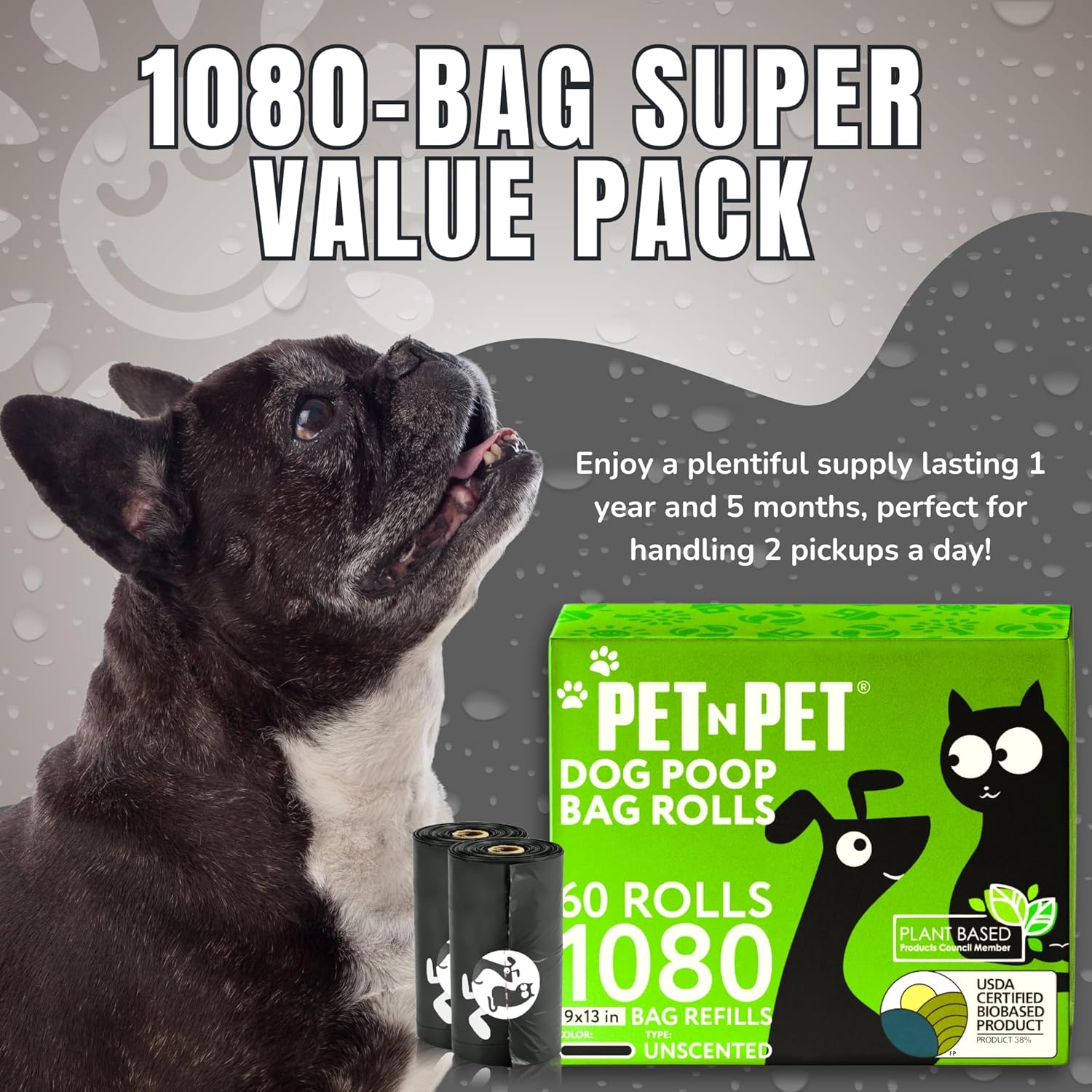 Obtén más por menos: ¡Abastécete de 1080 bolsas de basura para perros de PET N PET! Con 60 rollos de 18 bolsas cada una a solo 0.02 centavos por cuenta, nunca tendrás que preocuparte por reabastecer constantemente nuevamente.