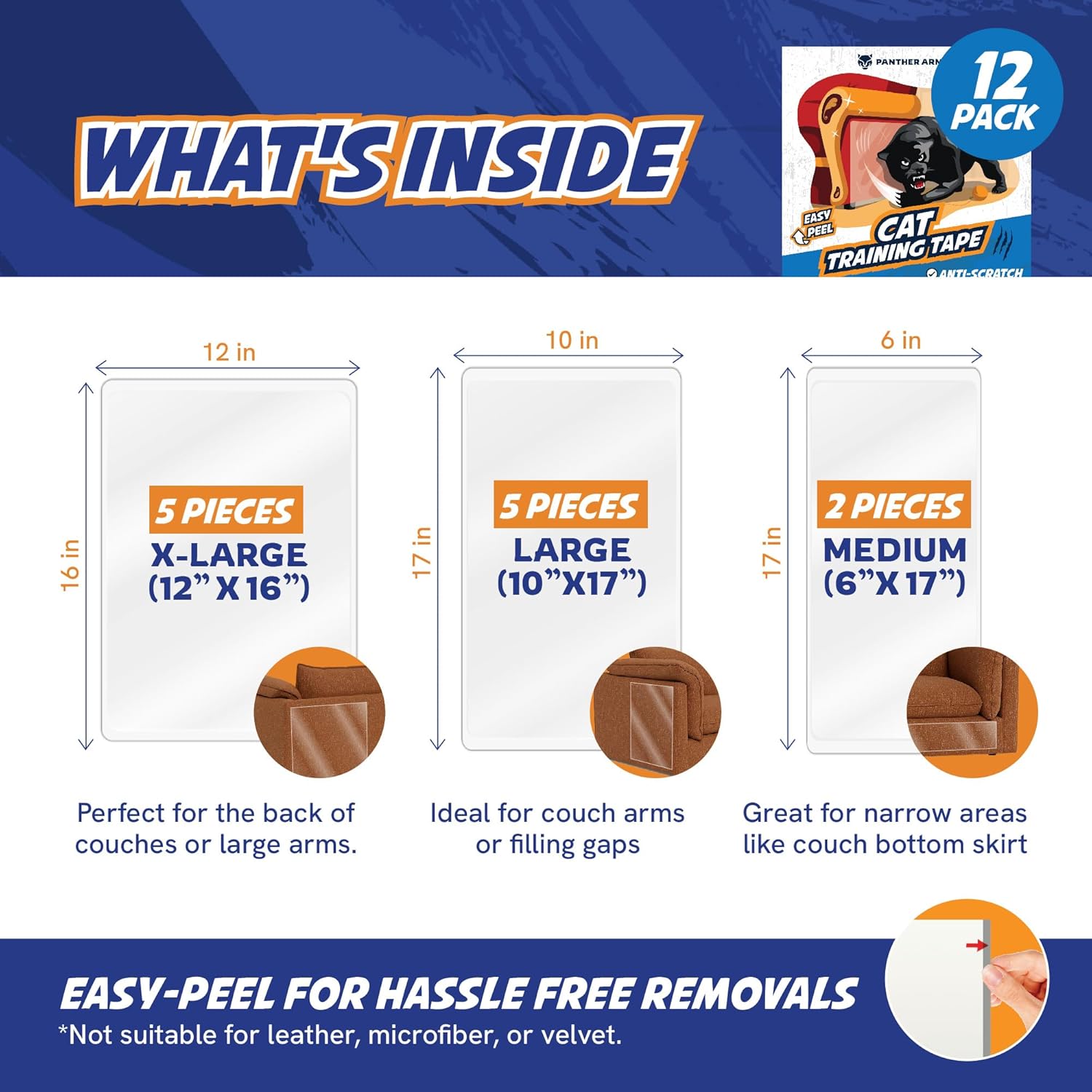 Entrena a tu gato al instante: la mejor cinta disuasiva de arañazos para gatos de doble cara; es nueva en la ciudad y está lista para rodar. ¡Pero no hay rollo! Las láminas se empaquetan planas y se pueden plegar fácilmente en cualquier esquina. Las láminas adhesivas de la cinta anti-arañazos proporcionan una superficie de cubierta más que suficiente para evitar arañazos de los gatos. Entrenar a tu gato con Panther Armor puede ser la mejor inversión en la protección de tus muebles. La cinta anti-arañazos se puede aplicar en cualquier sofá tapizado, silla, puertas, alfombras, etc.