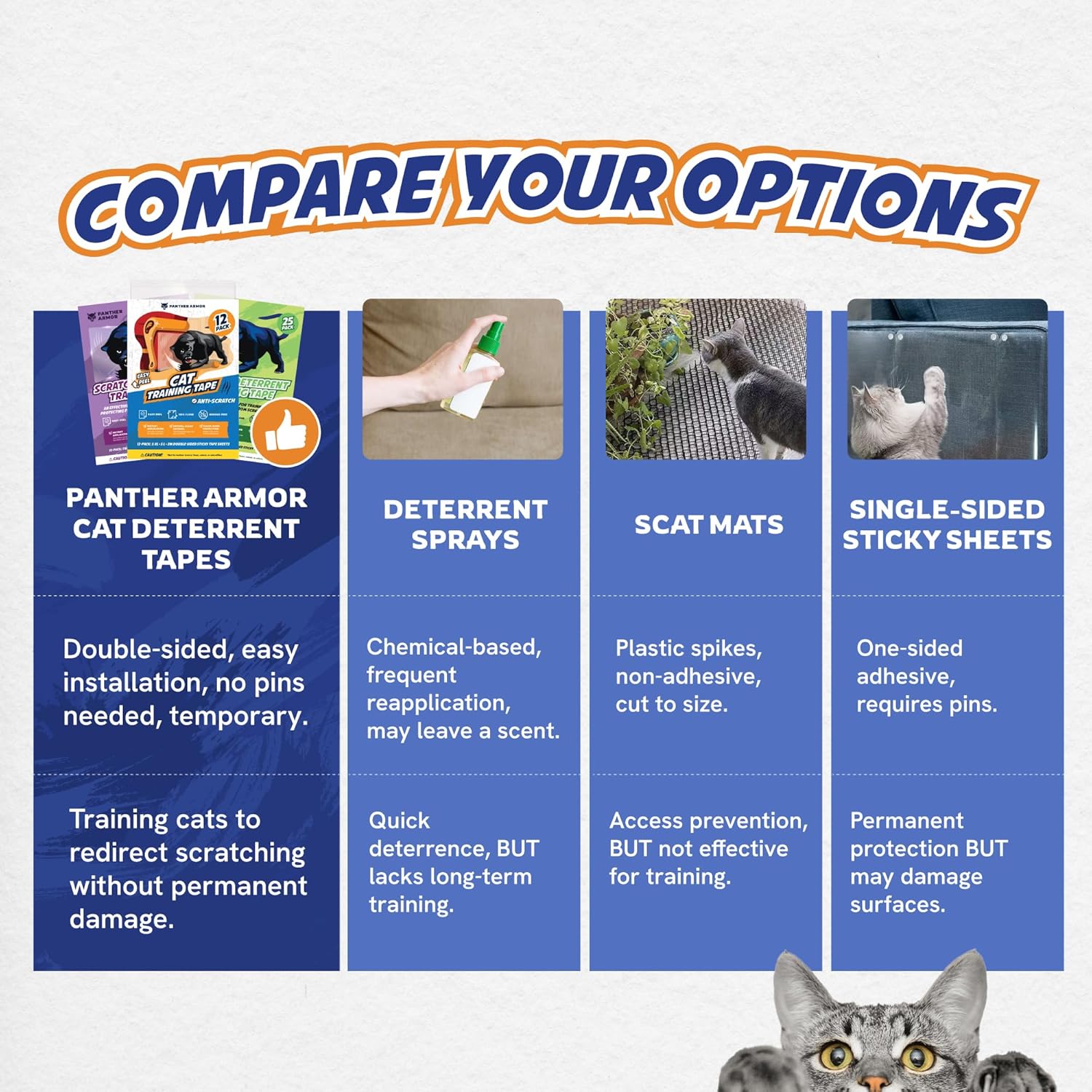 Evita y protege: las cintas repelentes son altamente eficaces debido a su tamaño y material pegajoso. Inmediatamente detienen y evitan que los gatos o perros arañen a través de ellos. Di adiós a las tiras antiguas. ¿Estás harto de que el gato te arañe el sofá? Los arañazos no serán un problema una vez que le enseñes a tu gato dónde no arañar usando productos Panther Armor: los mejores protectores de garras de gato de la ciudad.