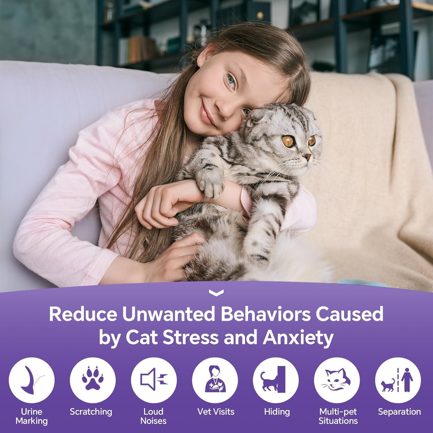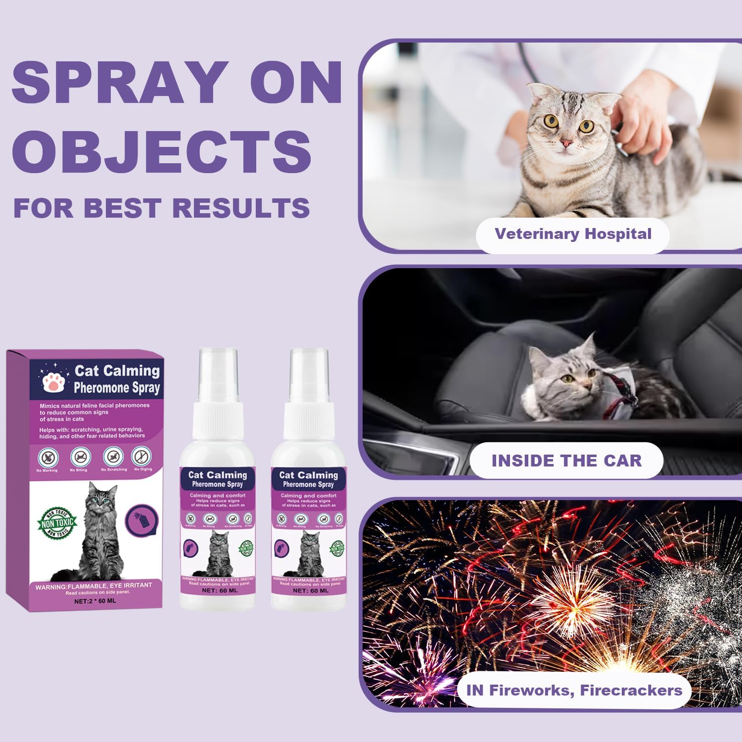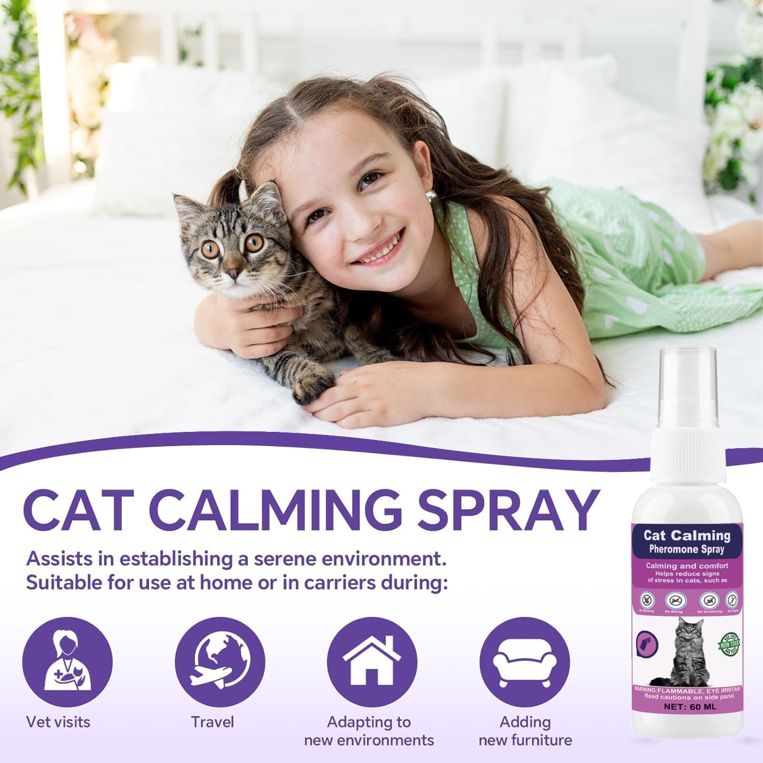 Alivia eficazmente la ansiedad de los gatos: eficaz para el 90% de los gatos para reducir las peleas con perros, rascarse, marcas de orina, dejar de orinar, rociar, esconderse y otros comportamientos entre varios gatos y gatitos en la casa. El spray de feromonas para gatos puede reducir el estrés del gato durante visitas veterinarias, viajes, nuevos entornos y ruidos fuertes (truenos, fuegos artificiales, etc.)