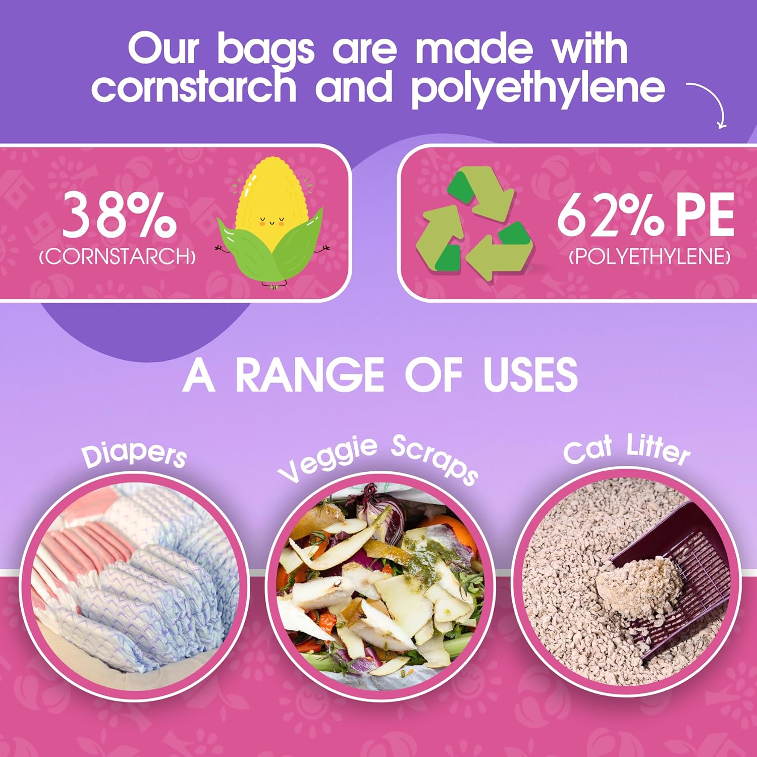 Deja atrás las preocupaciones por los residuos: las bolsas para perros PET N PET son 38% a base de plantas y 62% polietileno. Esto le da menos de qué preocuparse durante sus paseos con su amigo mascota al eliminar el 38% del plástico.
