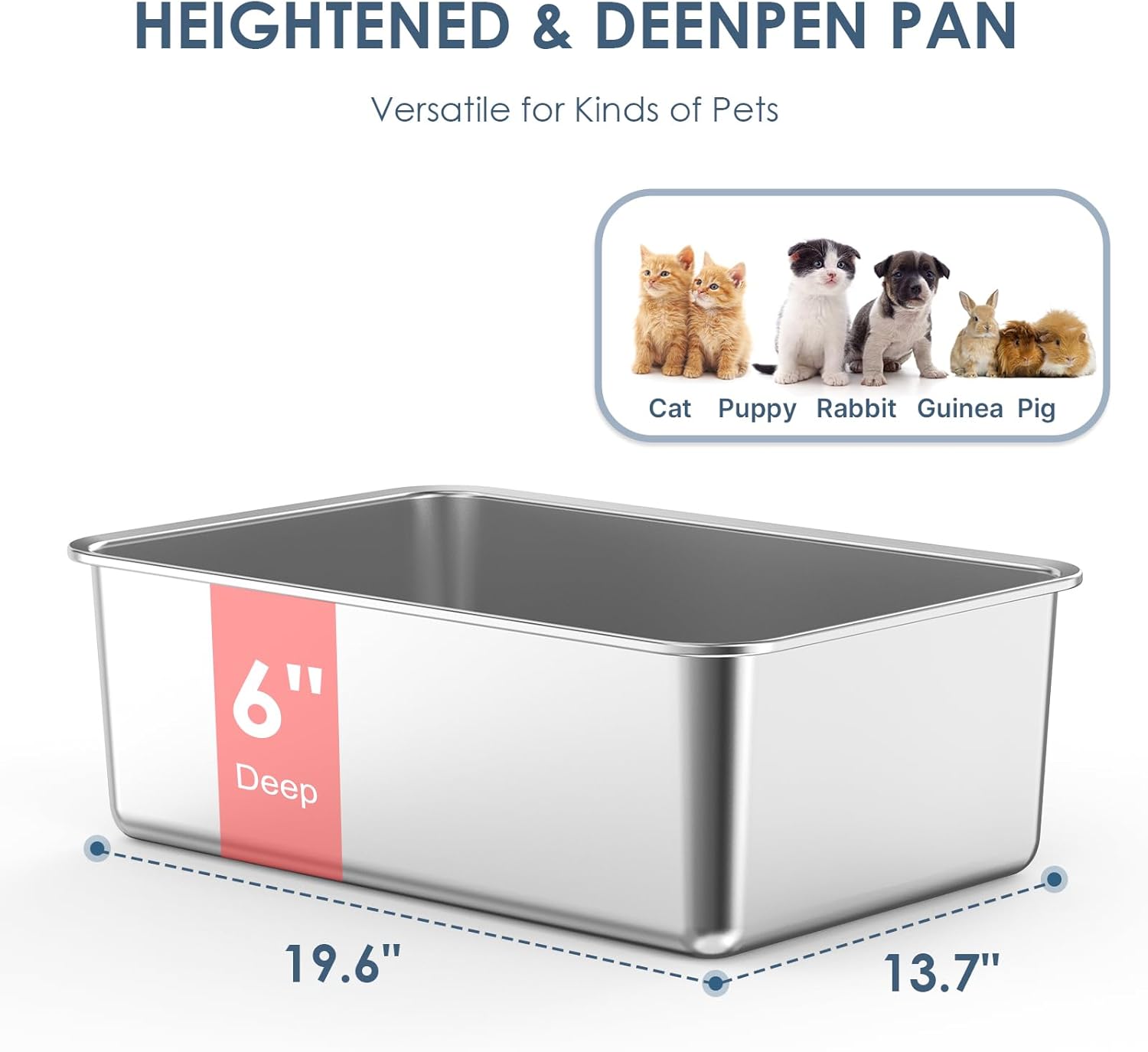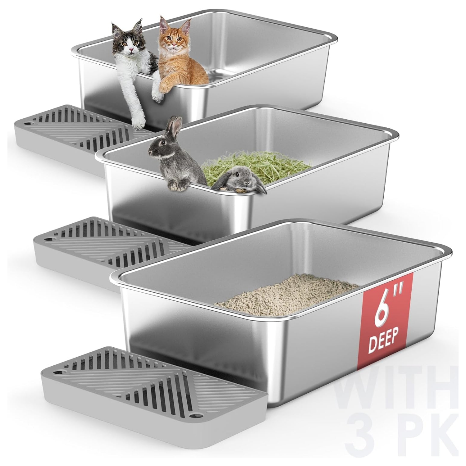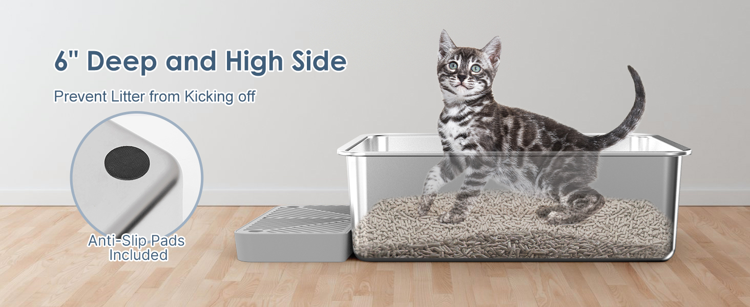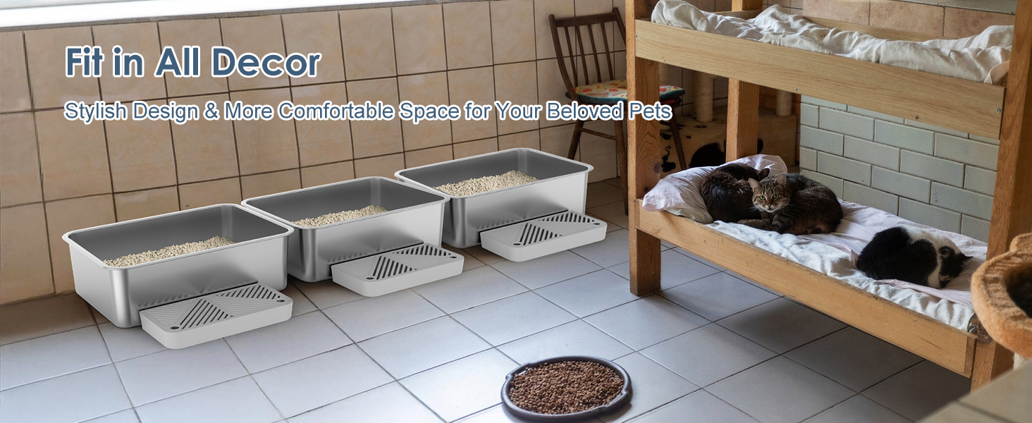 Paquete de 3 cajas de arena para gatos de acero inoxidable para múltiples gatos Familia: paquete de 3 cajas de arena para gatos extra grandes con 6 pulgadas de profundidad y 26 L de capacidad para cada uno es una opción perfecta para la familia de varios gatos. El diseño apasionado y profundo es ideal para gatos grandes, evitando que los gatos salpiquen arena fuera de las sartenes y permiten privacidad. Espacio espacioso que ofrece a los gatos moverse cómodamente mientras hacen sus negocios