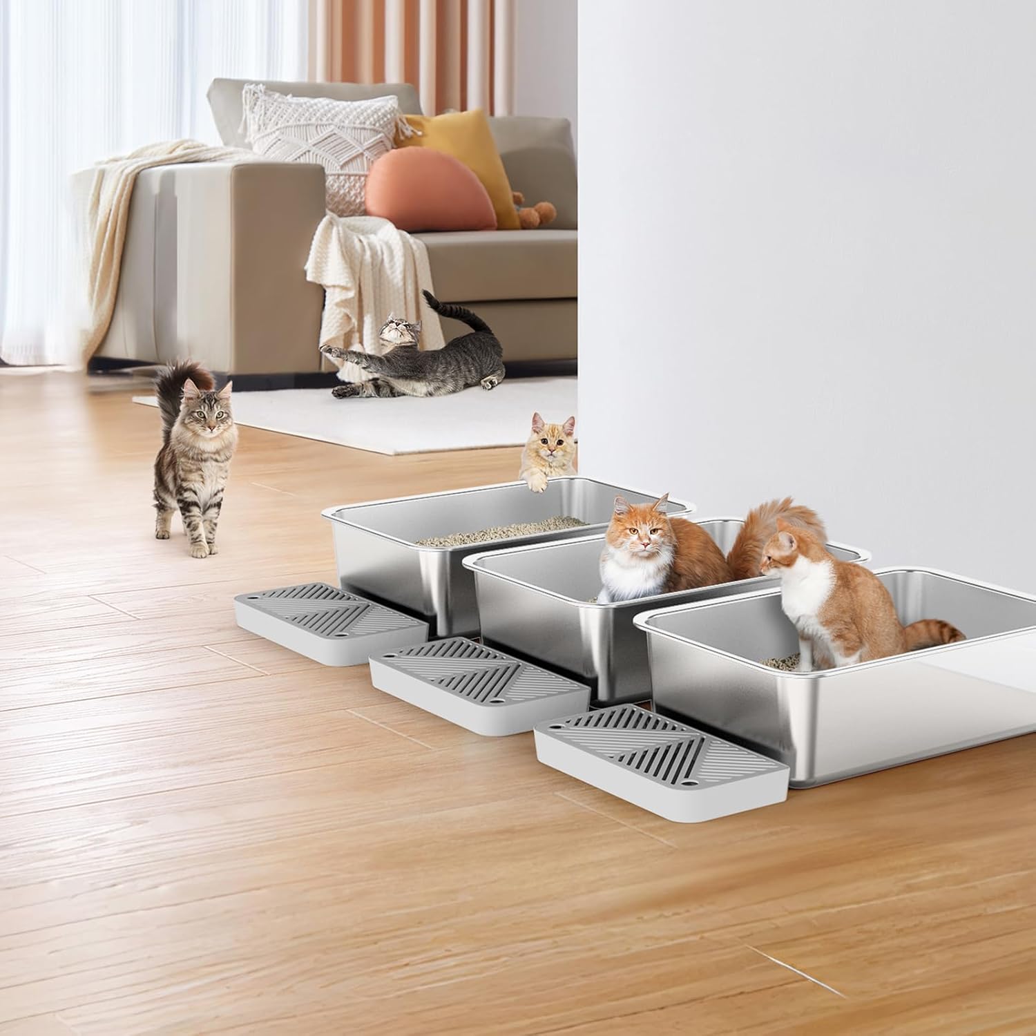 Excelente opción para la familia de gatos múltiples: Para eliminar la necesidad de que tus gatos luchen por la caja de arena de acero inoxidable para gatos, recibirás 3 cajas de arena de acero inoxidable y 3 estribos de arena que son intercambiables, para que puedas cuidar fácilmente de varios gatitos en tu casa. No más peleas en el hogar de varios gatos