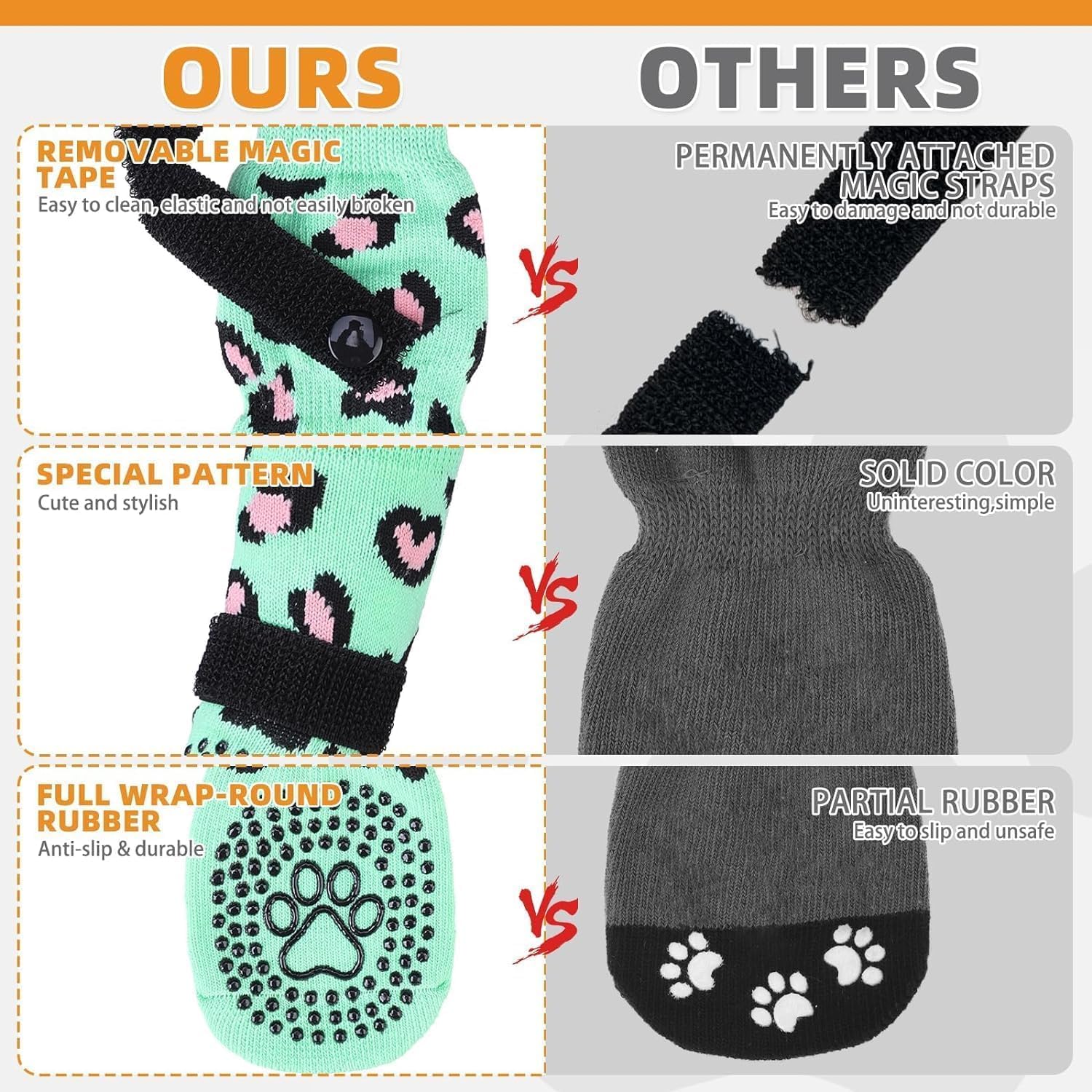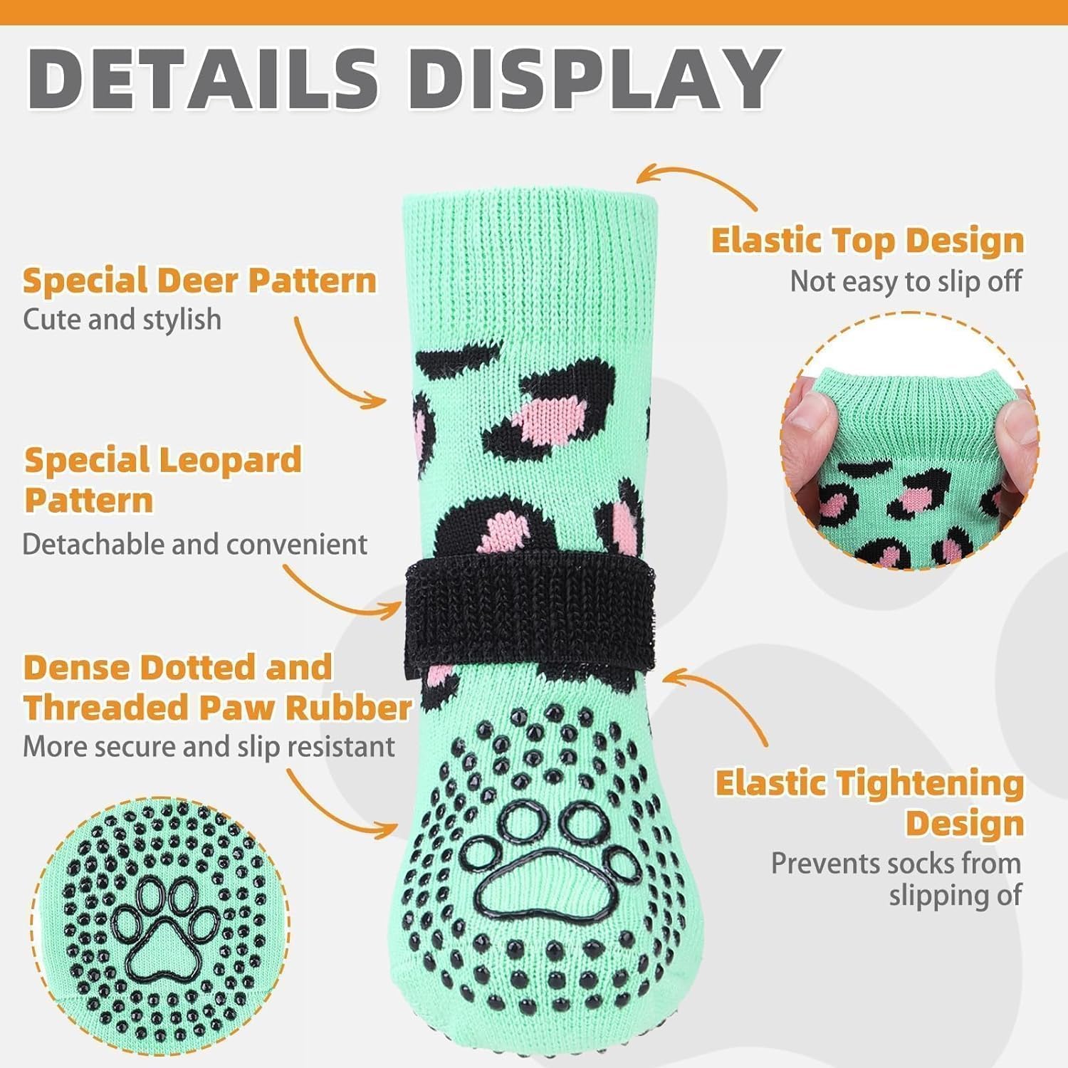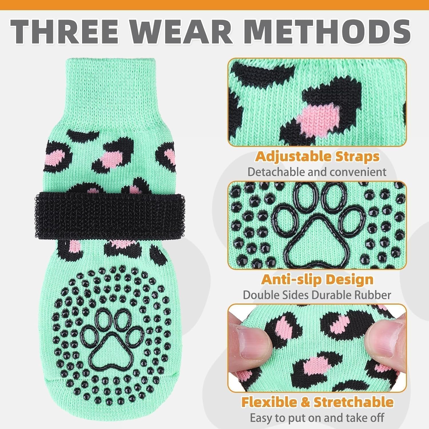 Antideslizante de doble cara: cada lado del calcetín tiene el agarre, lo que proporciona tracción adicional cuando tu perro camina sobre un suelo liso. Incluso si los calcetines están torcidos, aún pueden funcionar. Además, el diseño del agarre de doble cara garantiza una vida útil más larga de los calcetines. Cuando el agarre en un lado está desgastado y no tiene efecto antideslizante, puede hacer que el perro se use en el otro lado, ejerciendo un nuevo efecto antideslizante.