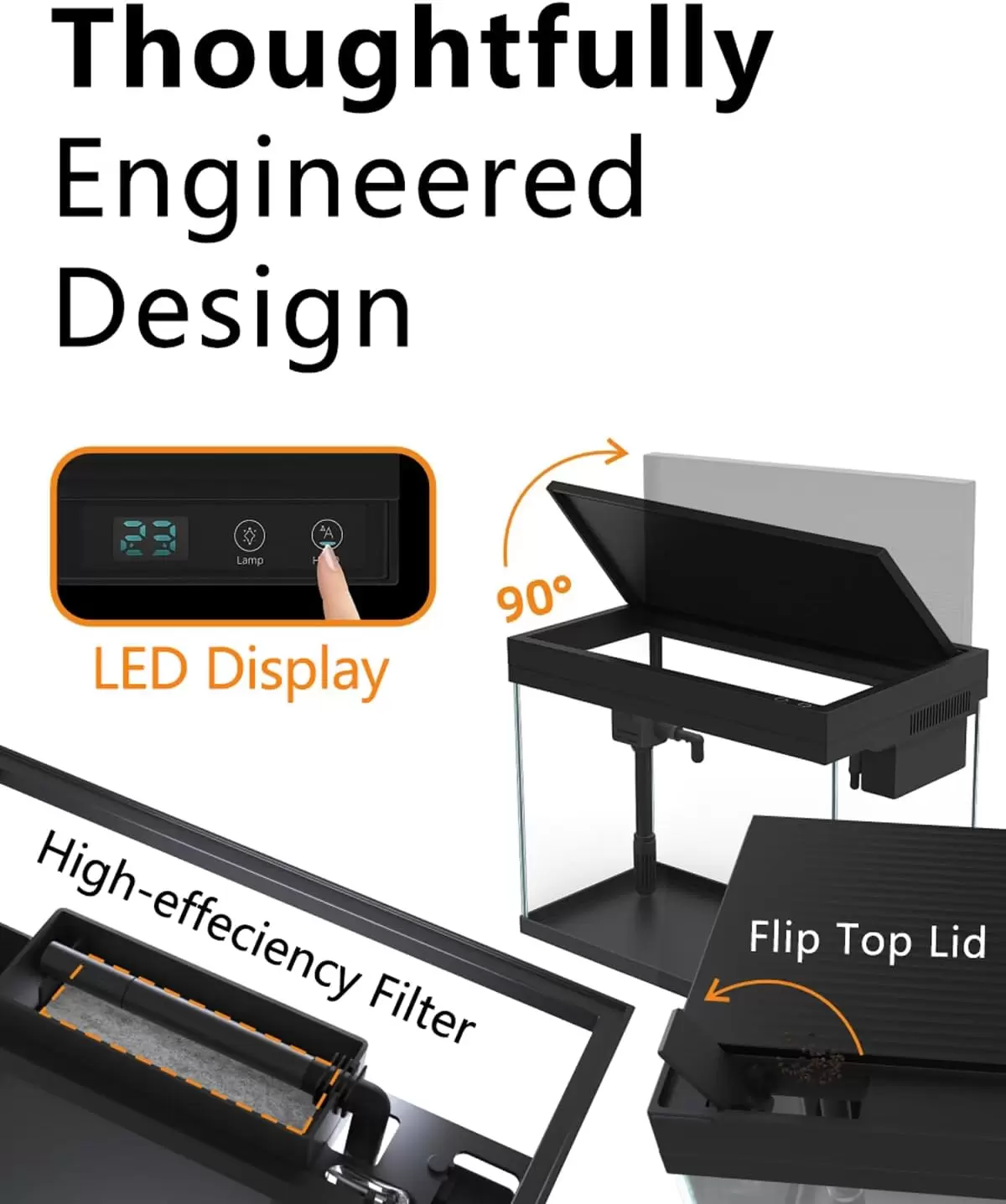 Sistema de control táctil inteligente: proporciona un panel de un solo toque para un ajuste de luz sin esfuerzo, control de niebla de 3 etapas y visualización digital de temperatura en tiempo real. Disfrute de un control inteligente sin problemas directamente en el tanque, sin necesidad de aplicación ni Internet.