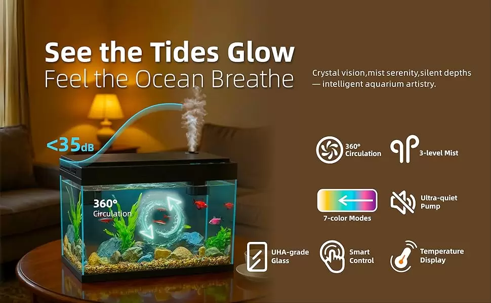 Humidificador integrado y cámara de aroma: el kit de inicio de acuario ofrece control de niebla de 3 niveles para aliviar la sequedad interior, con un compartimento de aroma sellado que garantiza cero contaminación del agua. Perfectamente adecuado para dormitorios, escritorios u oficinas.