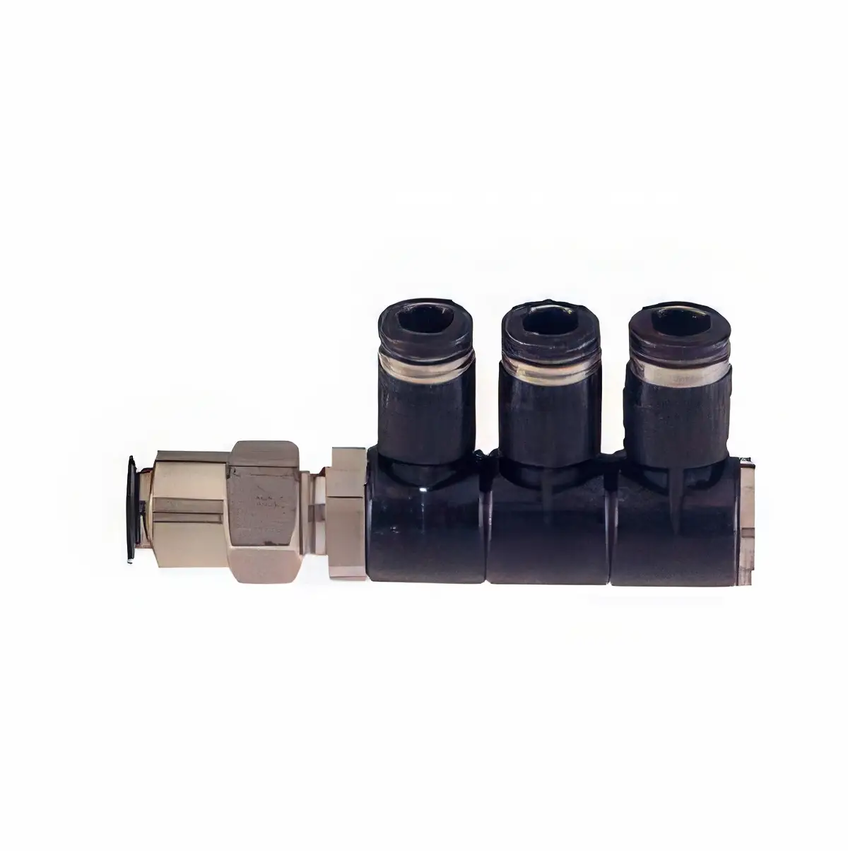 El ADA 1-3 Branch es un accesorio de distribución compacto diseñado para dividir el suministro de CO2 en tres líneas independientes, facilitando la alimentación de múltiples difusores desde una única fuente de gas.