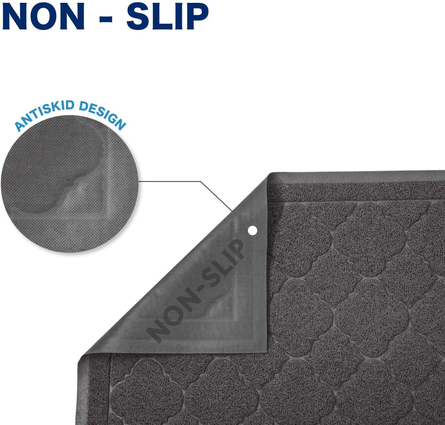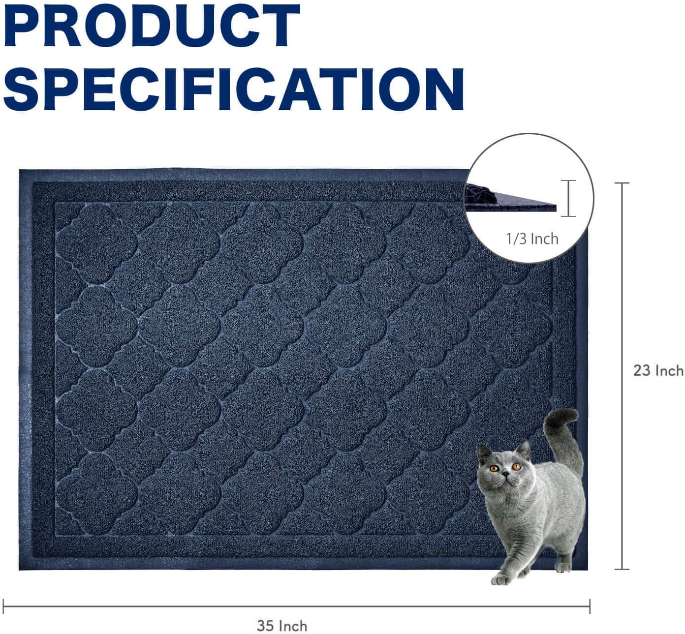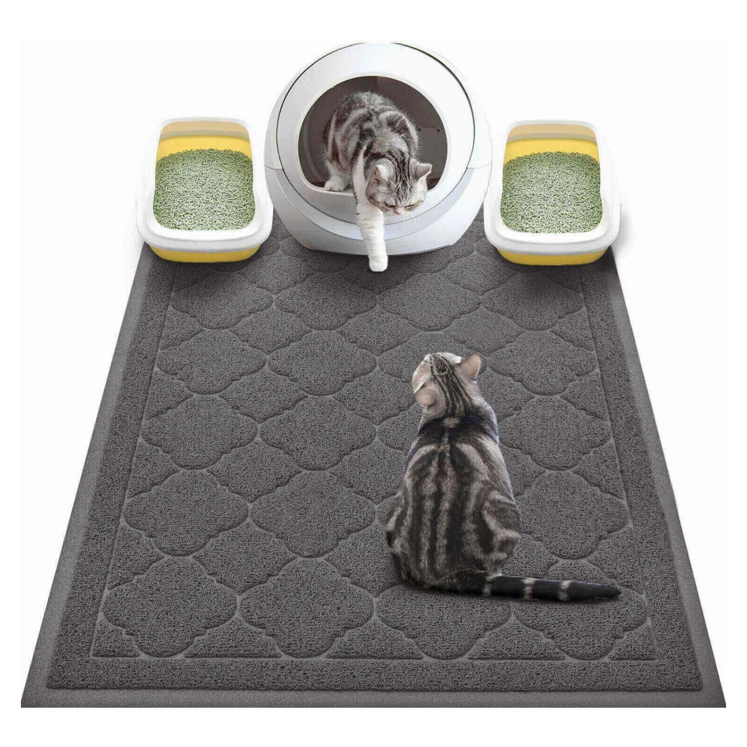 CARACTERÍSTICAS: Esta alfombra es duradera, resistente al agua y a la orina, suave para las patas y fácil de limpiar. Su parte trasera antideslizante la mantiene en su lugar y evita que la arena se derrame en el suelo. Su elegante diseño combina a la perfección con la decoración moderna y tradicional.