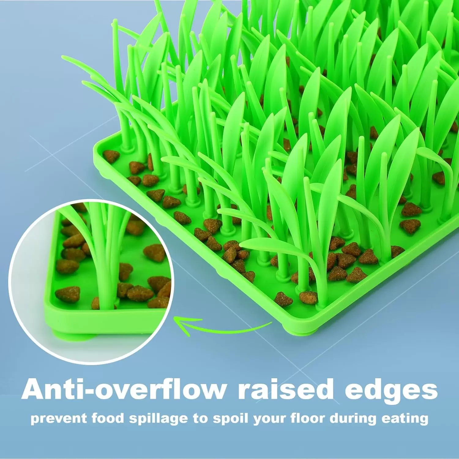 Alta calidad: tapete de césped para gatos hecho de material de silicona suave de grado alimenticio de alta calidad, seguro para tus mascotas, fuerte y resistente a las mordeduras, duradero y reutilizable, fácil de limpiar. Con bordes elevados antidesbordamiento, evita que los derrames de alimentos estropeen tu suelo durante la comida
