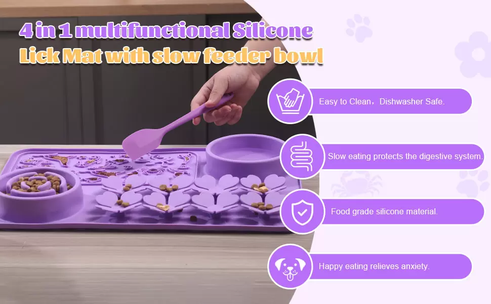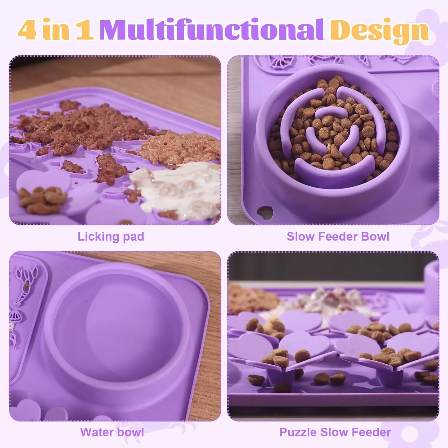 Diseño multifuncional 4 en 1: mejora la hora de comer con nuestros cuencos para perros de alimentación lenta. Esta solución todo en uno combina un alimentador de rompecabezas para perros, tapete para olfatear perros, tapete para lamer perros y cuenco de agua. Perfecto para alfombras de alimentación de mascotas, mantiene a tu cachorro comprometido mientras promueve hábitos alimenticios más saludables para razas grandes o perros pequeños.
