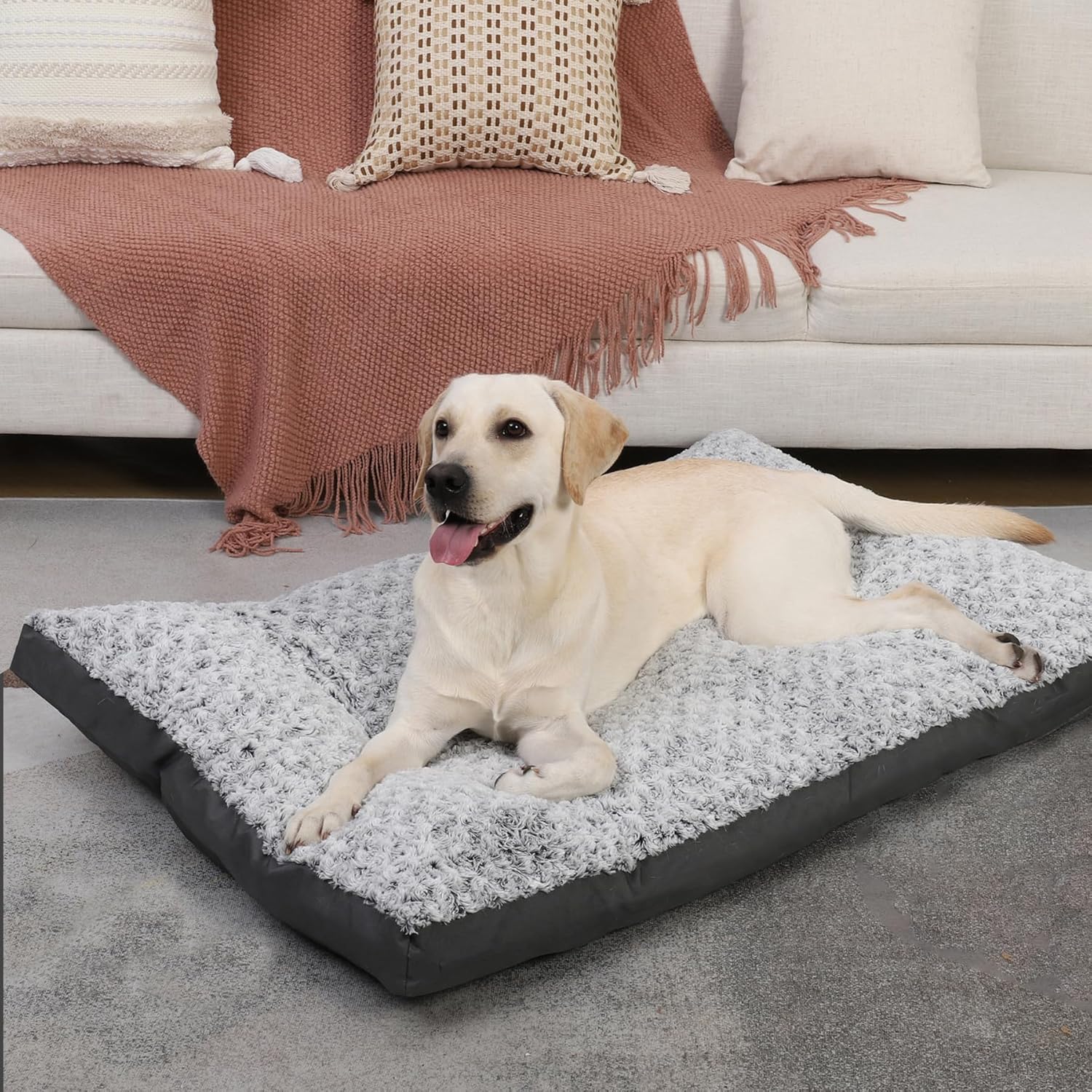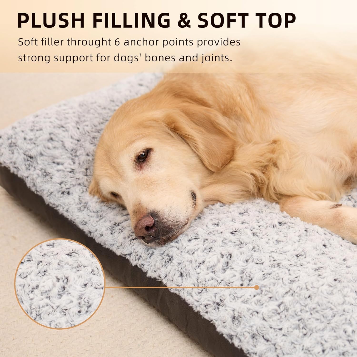 Relleno de felpa: relleno de 3 pulgadas de fibra de polipropileno a través de 6 puntos de anclaje, proporciona un fuerte apoyo para los huesos y articulaciones de los perros, aliviando eficazmente el dolor articular y la artritis.