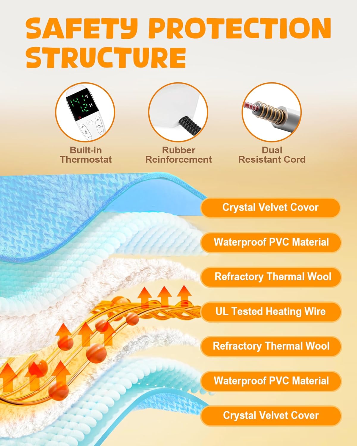 ESTRUCTURA DE PROTECCIÓN DE SEGURIDAD: La almohadilla térmica Furryplanet está hecha de material ignífugo multicapa y termostato incorporado, que puede evitar el sobrecalentamiento localizado. El cable de acero doble resistente a los mordiscos de 6 pies permite un uso fácil. Controlador fácil de sostener y controlar, pantalla LCD grande, clic sensible, garantía de seguridad (ten en cuenta que es normal que el controlador se caliente ligeramente cuando está en uso).