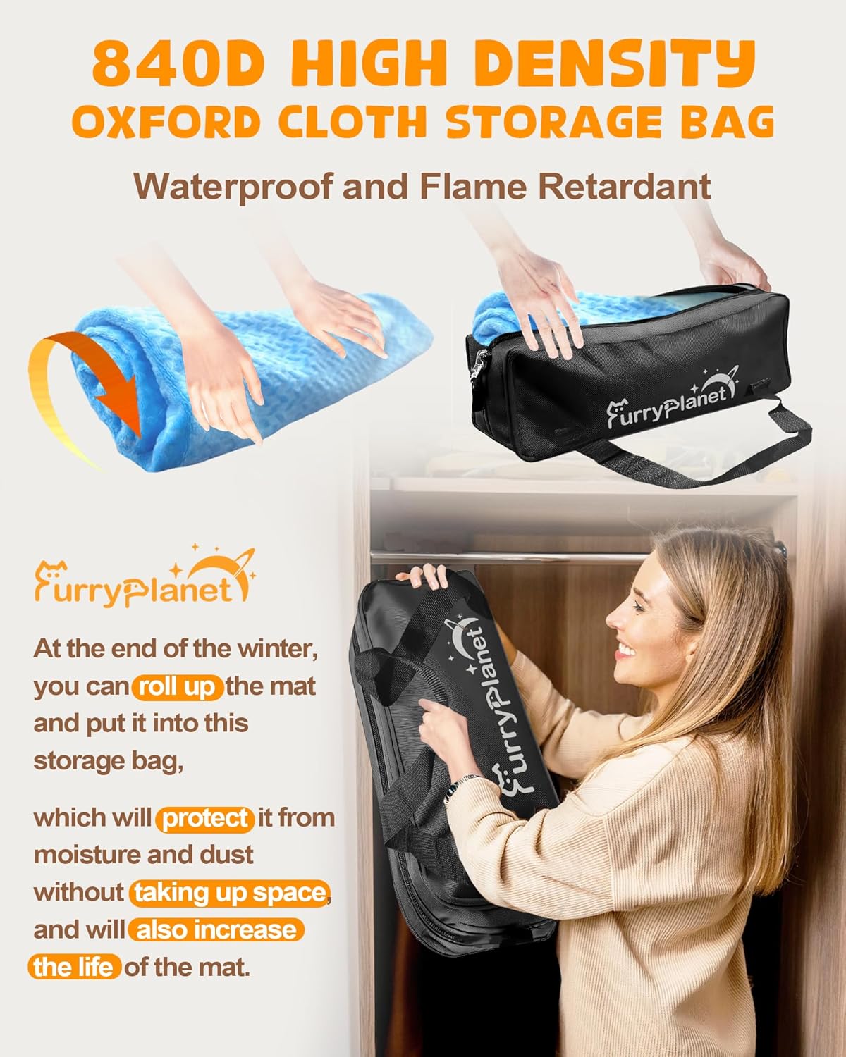 Bolsa de almacenamiento de tela Oxford de alta densidad 840D: La bolsa está hecha de material impermeable y ignífugo. Al final del invierno, puedes enrollar la alfombrilla y ponerla en esta bolsa de almacenamiento, que la protegerá de la humedad y el polvo. Al final del invierno, puedes enrollar la alfombrilla y ponerla en esta bolsa de almacenamiento, que la protegerá de la humedad y el polvo sin ocupar espacio, y también aumentará la vida útil de la alfombrilla.