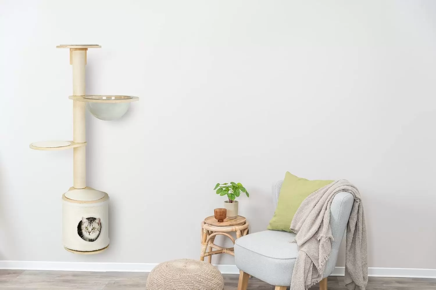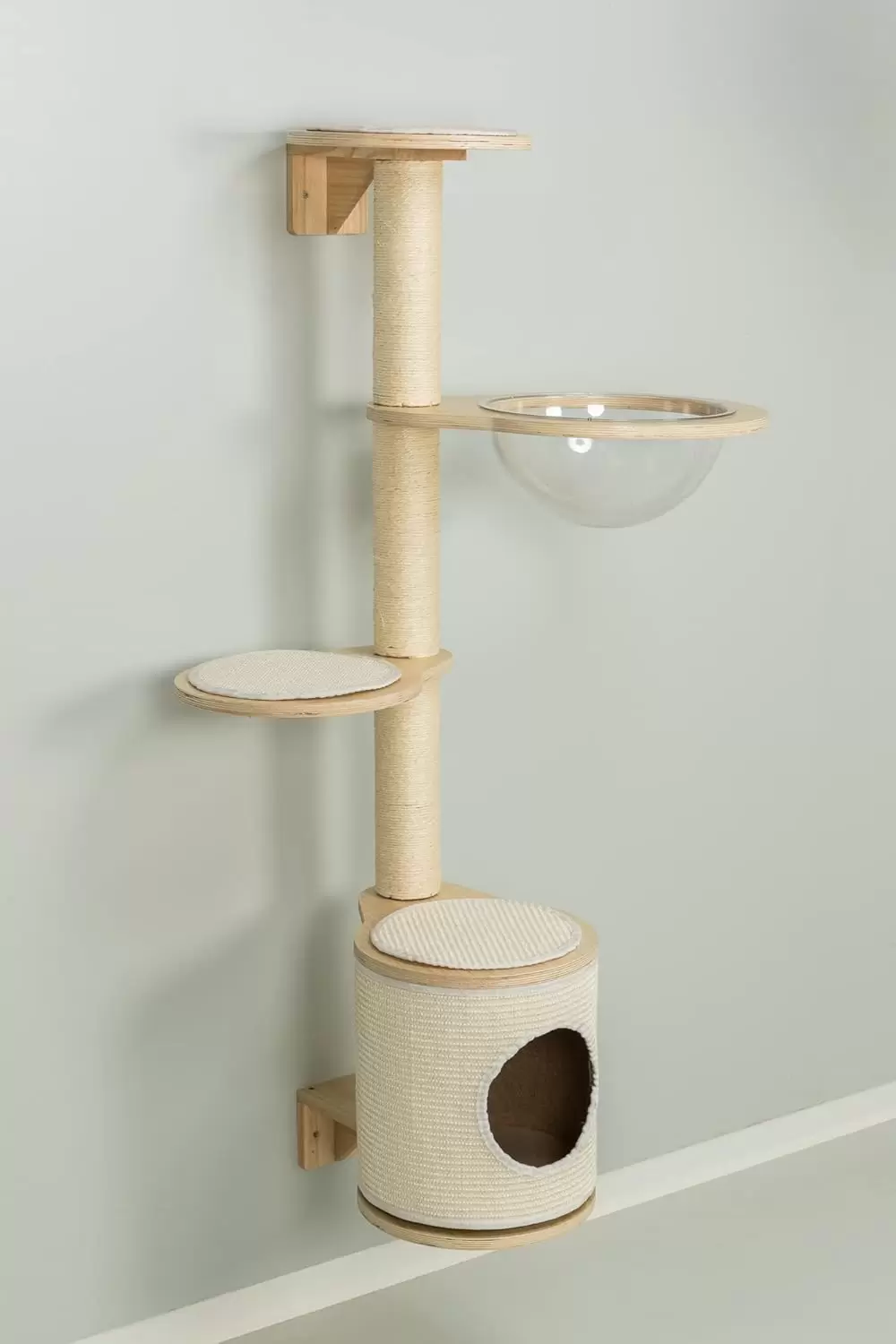 Rascador mural de lujo (ciento treinta y ocho centimetros) con madera barnizada. Ahorra espacio, tiene condominio y una moderna hamaca capsula. Perfecto para gatos.
