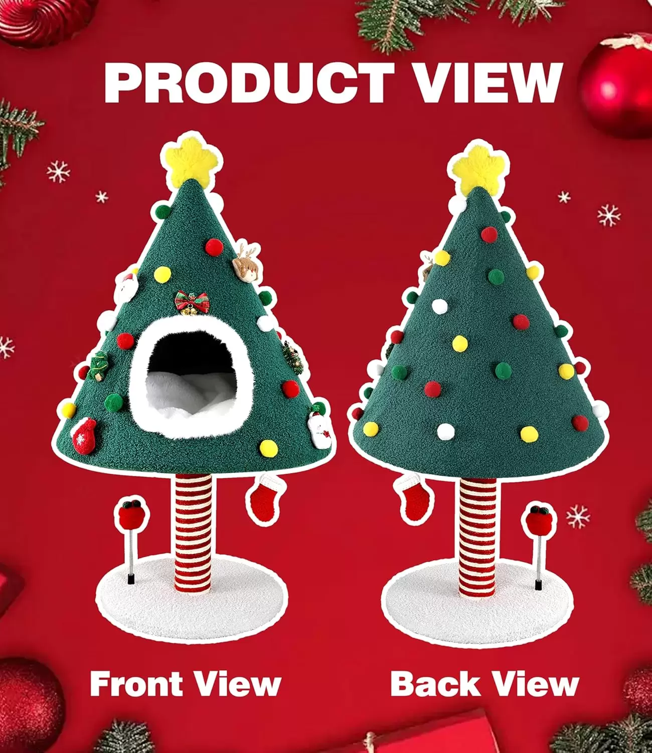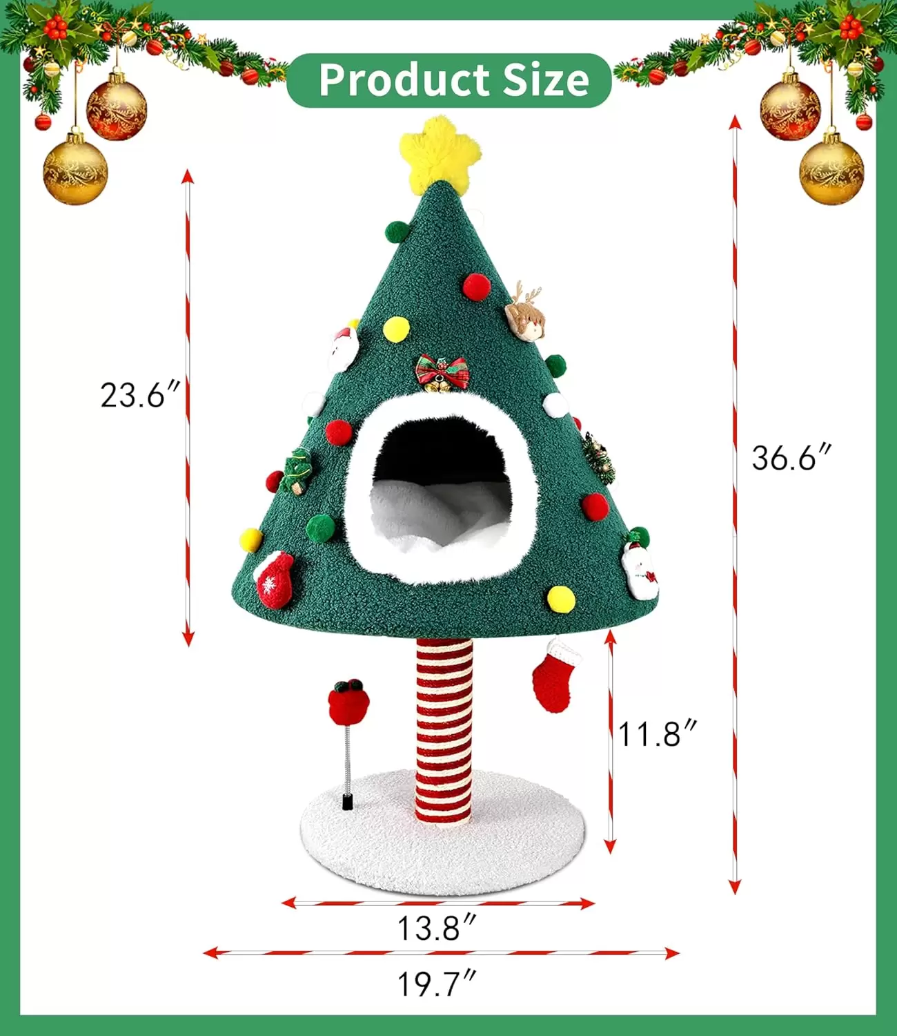 Árbol Rascador Navideño (51x51x91 cm) con nido iglú y poste de sisal duradero. Satisfaced la necesidad de rascado de tu gato y protege tus muebles. Fácil montaje.