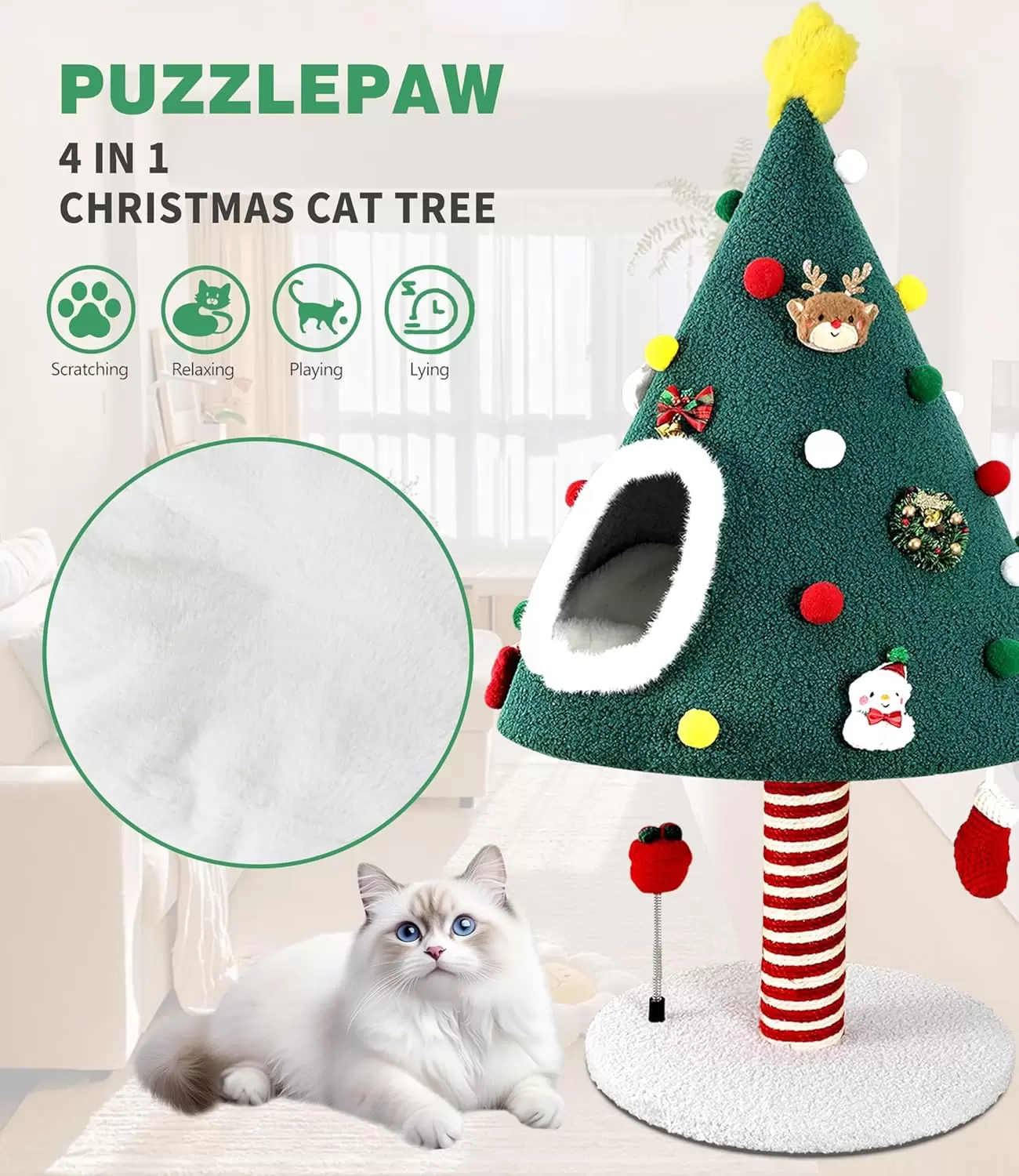 Amplio Nido/Refugio: Diseñado como un árbol, proporciona un refugio acogedor donde tu gato puede acurrucarse, dormir o esconderse. El interior de felpa ofrece un espacio cálido y seguro para la temporada de invierno.