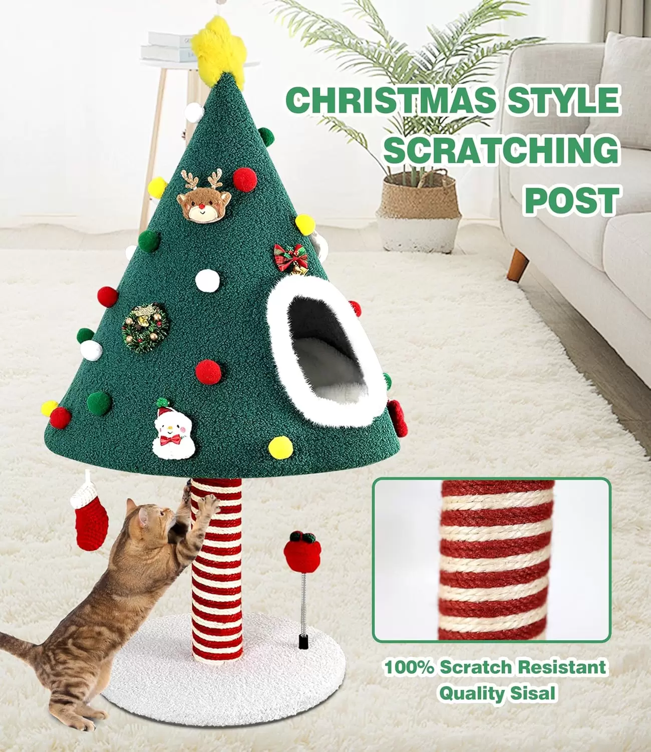 Poste de Sisal Protector: Protege tus muebles con nuestro poste rascador envuelto en cuerda de sisal 100% duradera. Su diseño festivo satisface la necesidad natural de arañazos de tu gato, salvando tus sillones y cortinas.