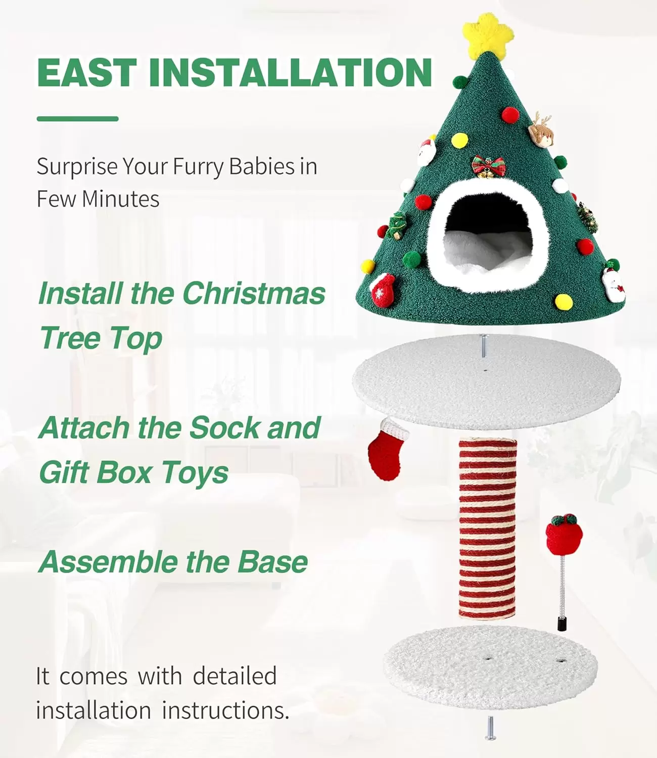 Este árbol para gatos es fácil de instalar y solo toma unos minutos (herramientas incluidas). Tu gato disfrutará rápidamente de su nuevo lugar festivo para jugar, rascarse y relajarse.