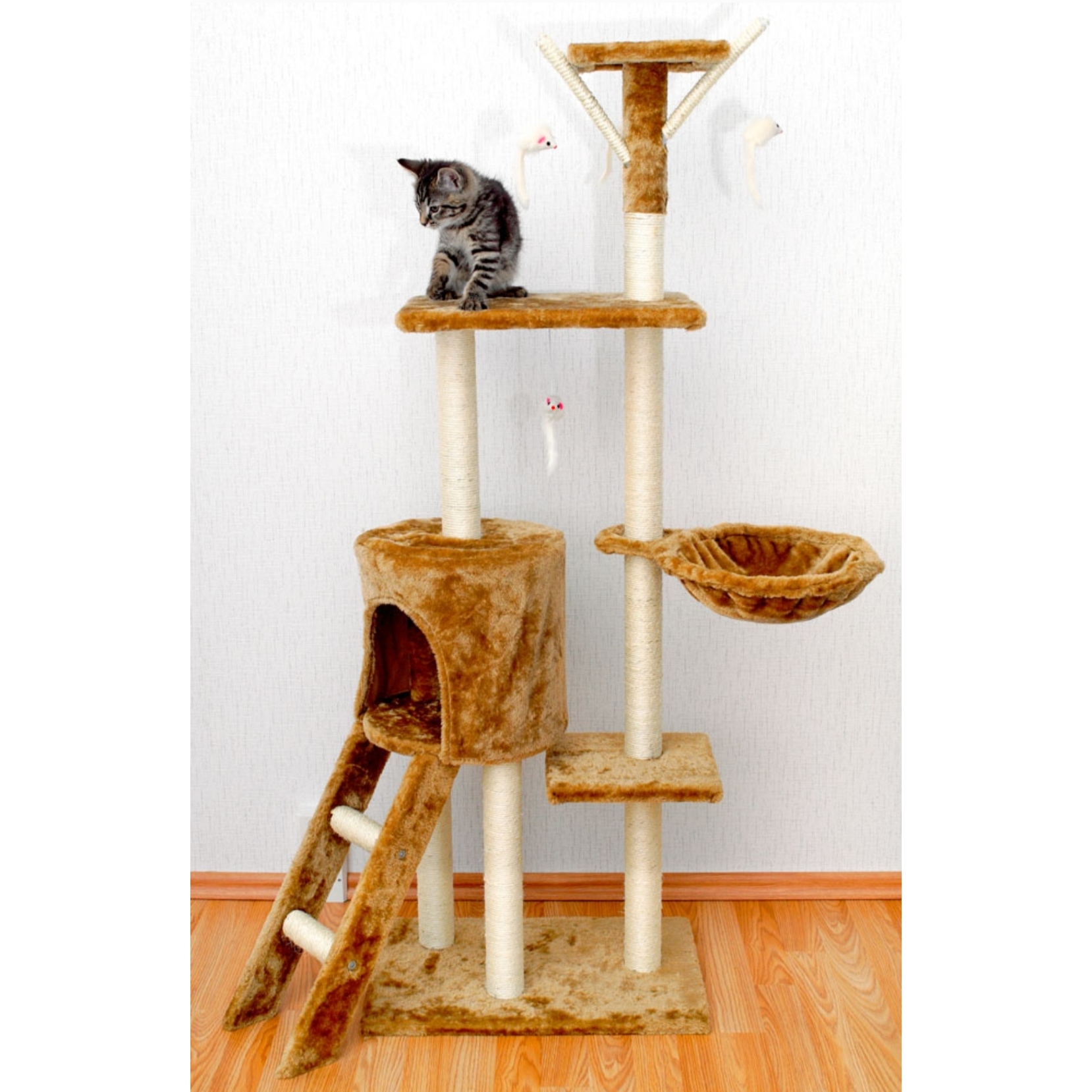 – Centro de Juegos: Equipado con 1 caseta, 2 plataformas, 1 nido, 1 escalera y 4 ratones de juego. Tu gato podrá realizar una amplia variedad de entrenamientos