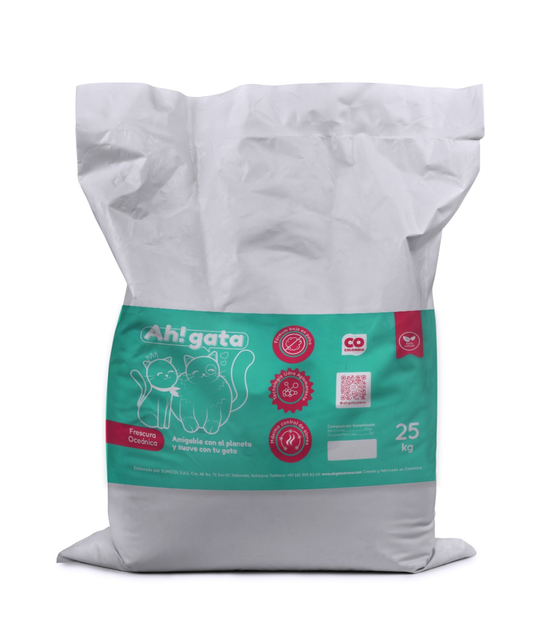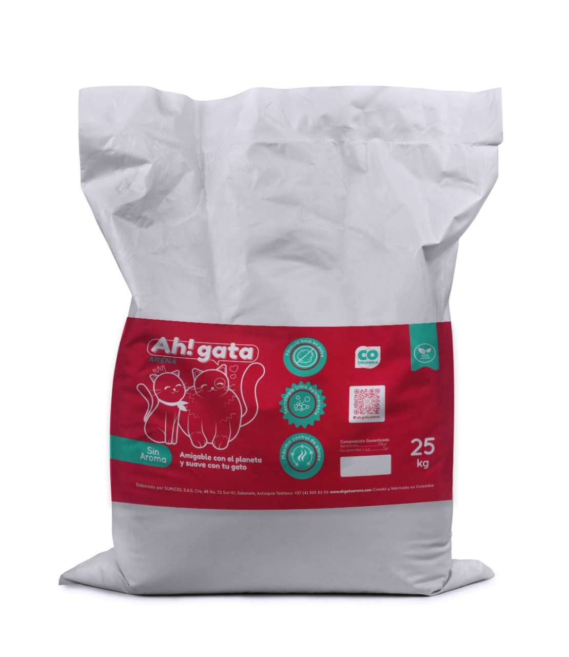 Ah! Gata es una arena orgullosamente desarrollada y fabricada en Colombia por Sumicol, una compañía de la Organización Corona.