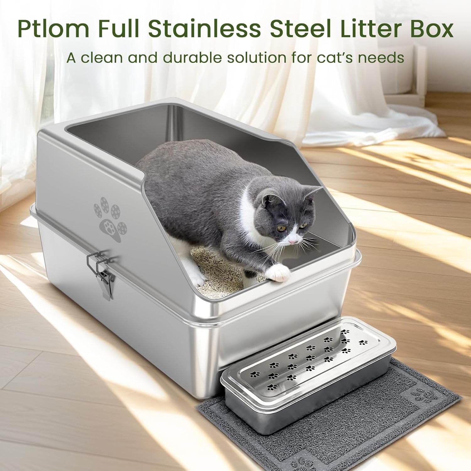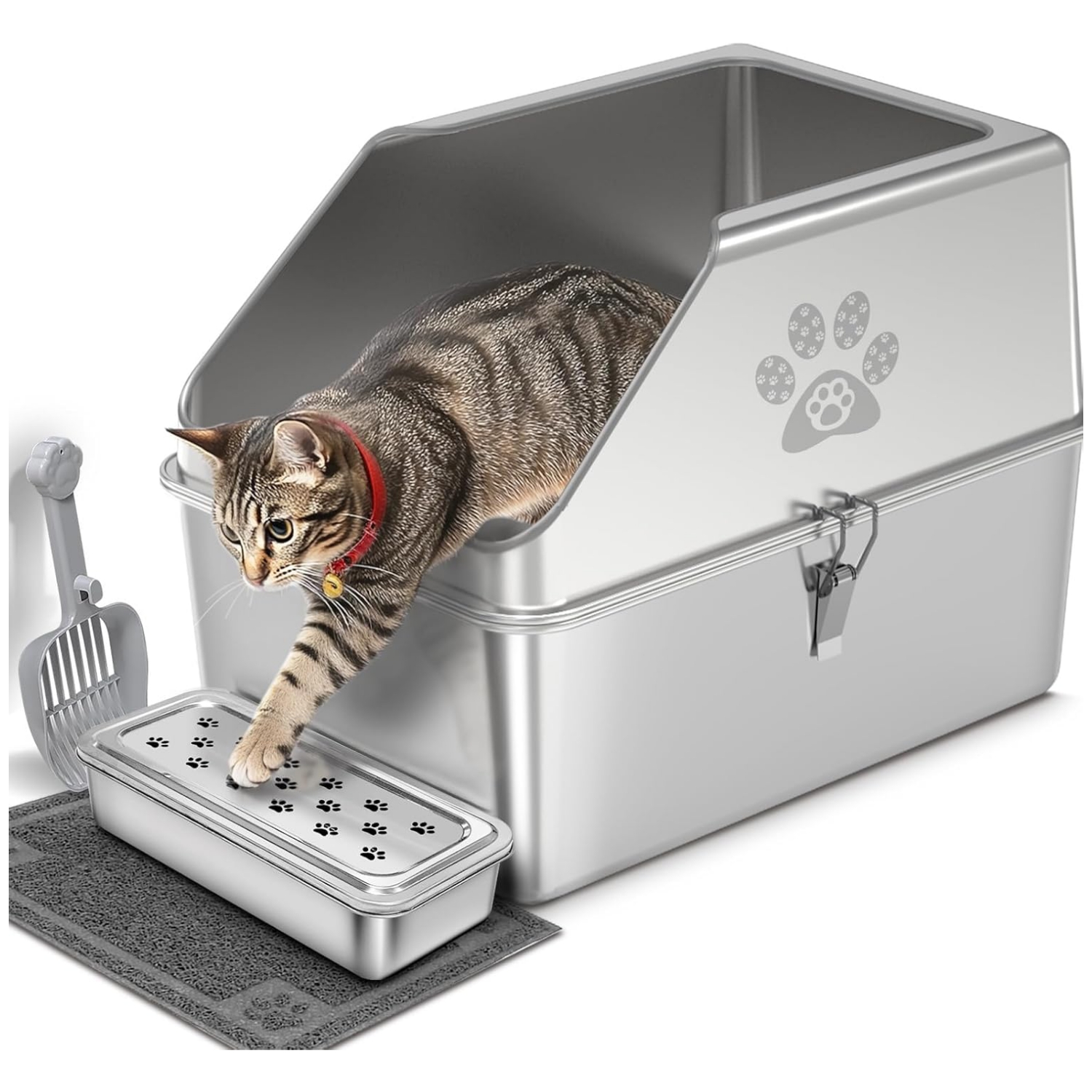 Arenero Abierto Alto de Acero Inoxidable para Gatos + Alfombra y Pala
