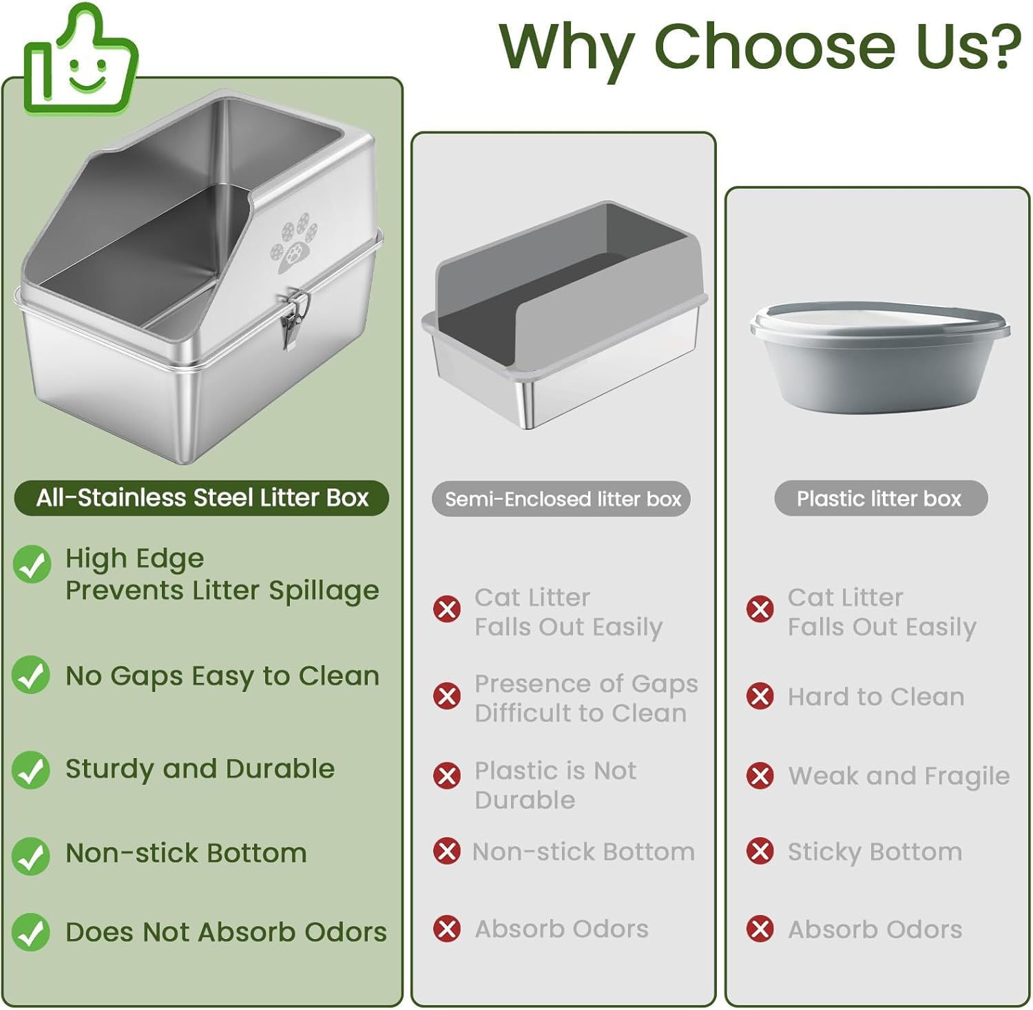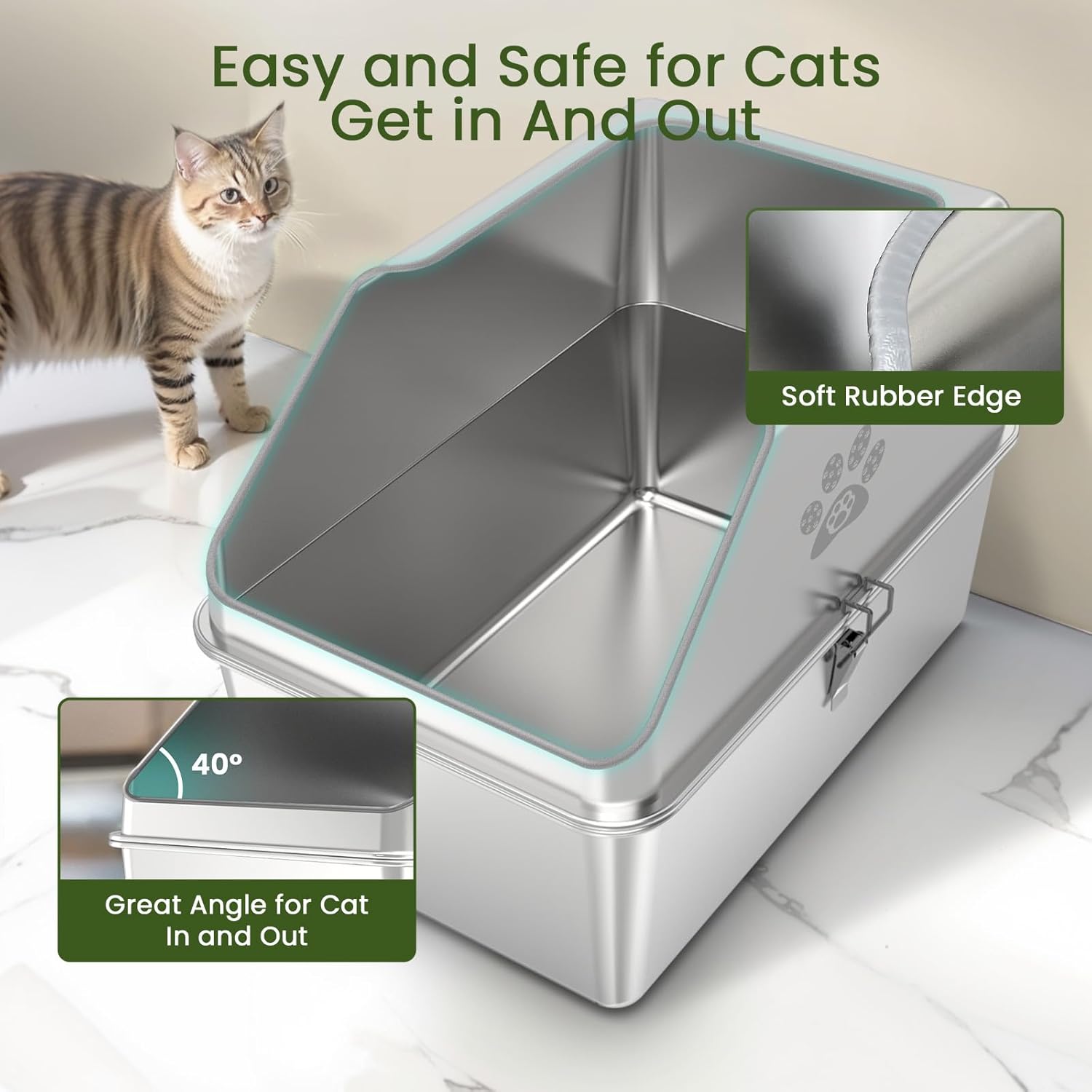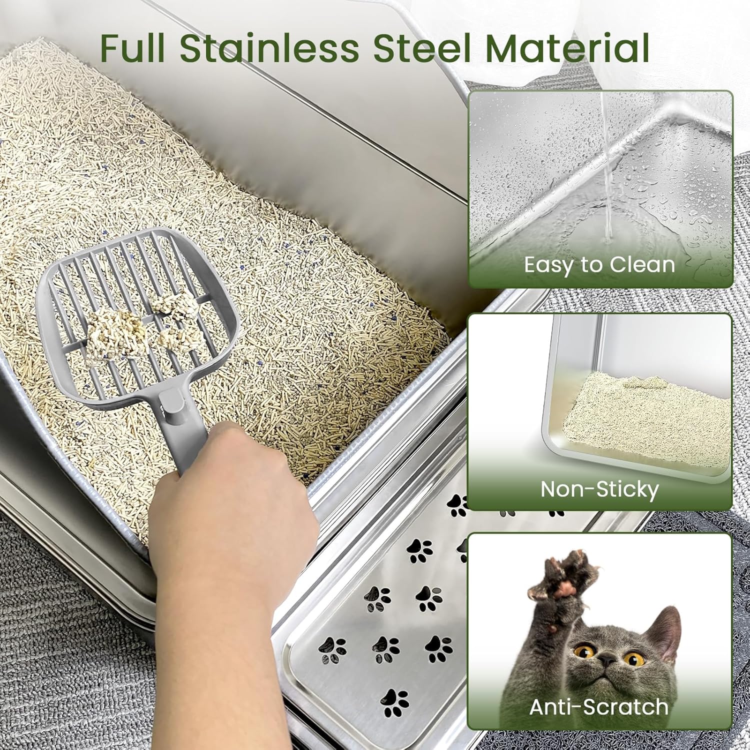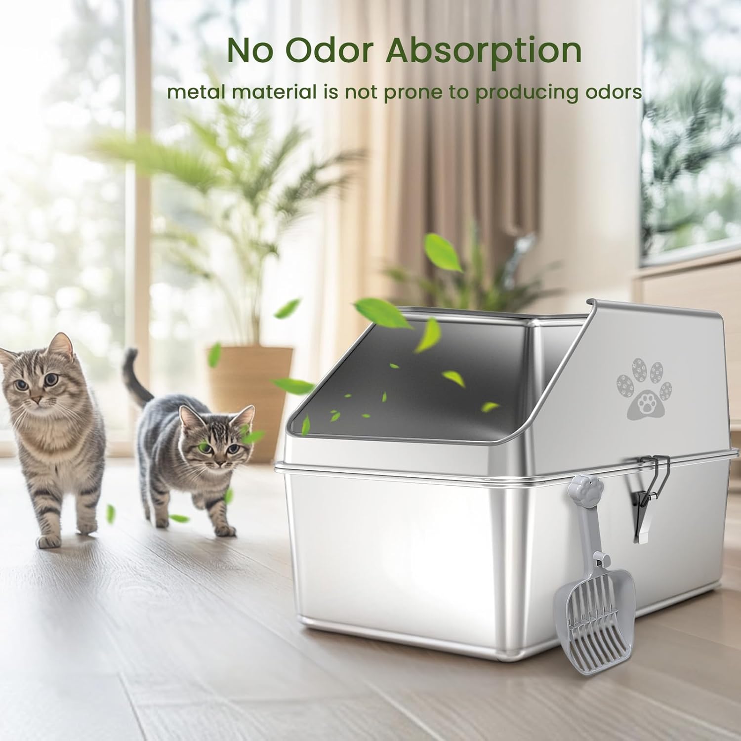 Sin olor y fácil de limpiar: esta caja de arena de metal está hecha de acero inoxidable de alta calidad con una superficie lisa y antiadherente que evita que la basura y los residuos se peguen, no absorbe el olor. Material de metal resistente que resiste abolladuras, arañazos y abrasiones, asegurando una larga vida útil y fácil limpieza. A diferencia de las bandejas de plástico, una bandeja de arena inoxidable es resistente al óxido y antiadherente, proporcionando un ambiente fresco e higiénico para los gatos.