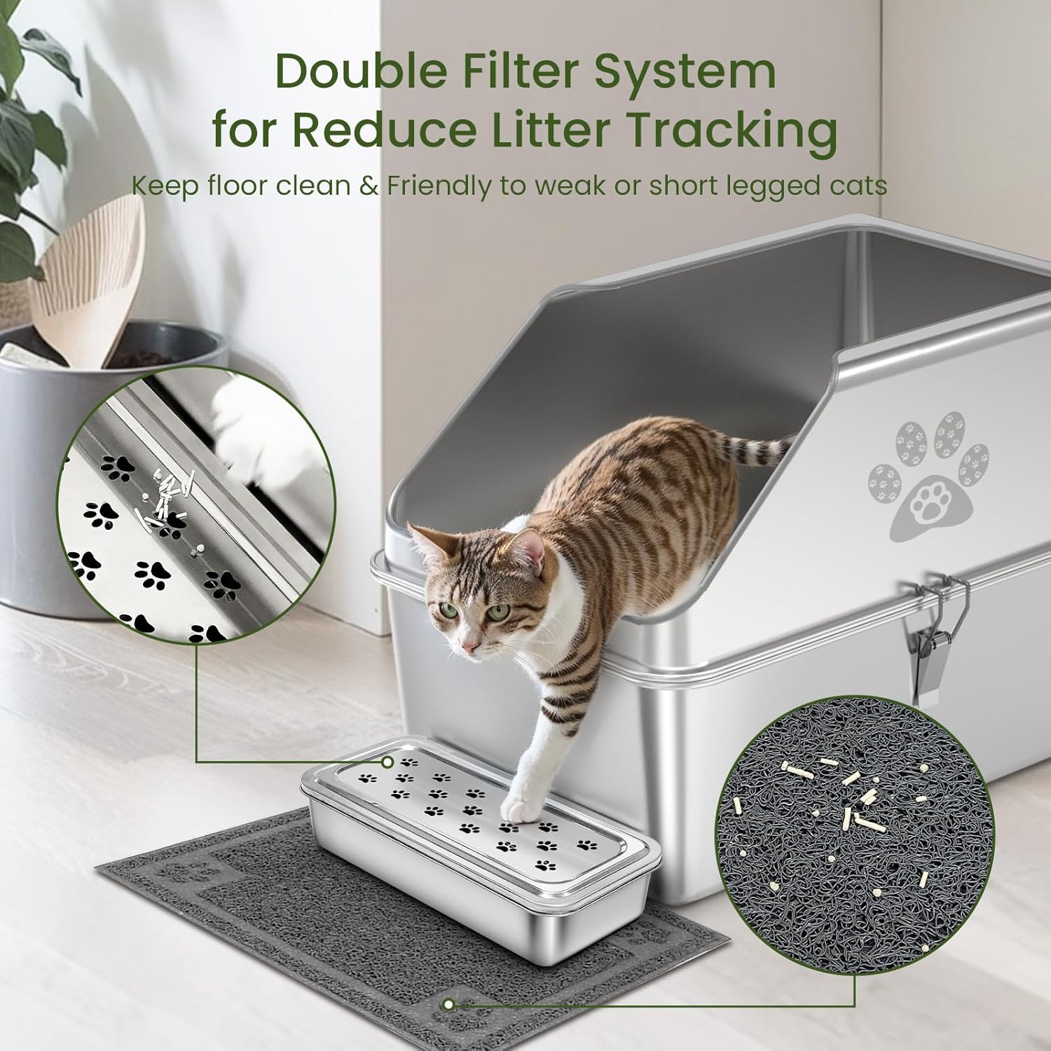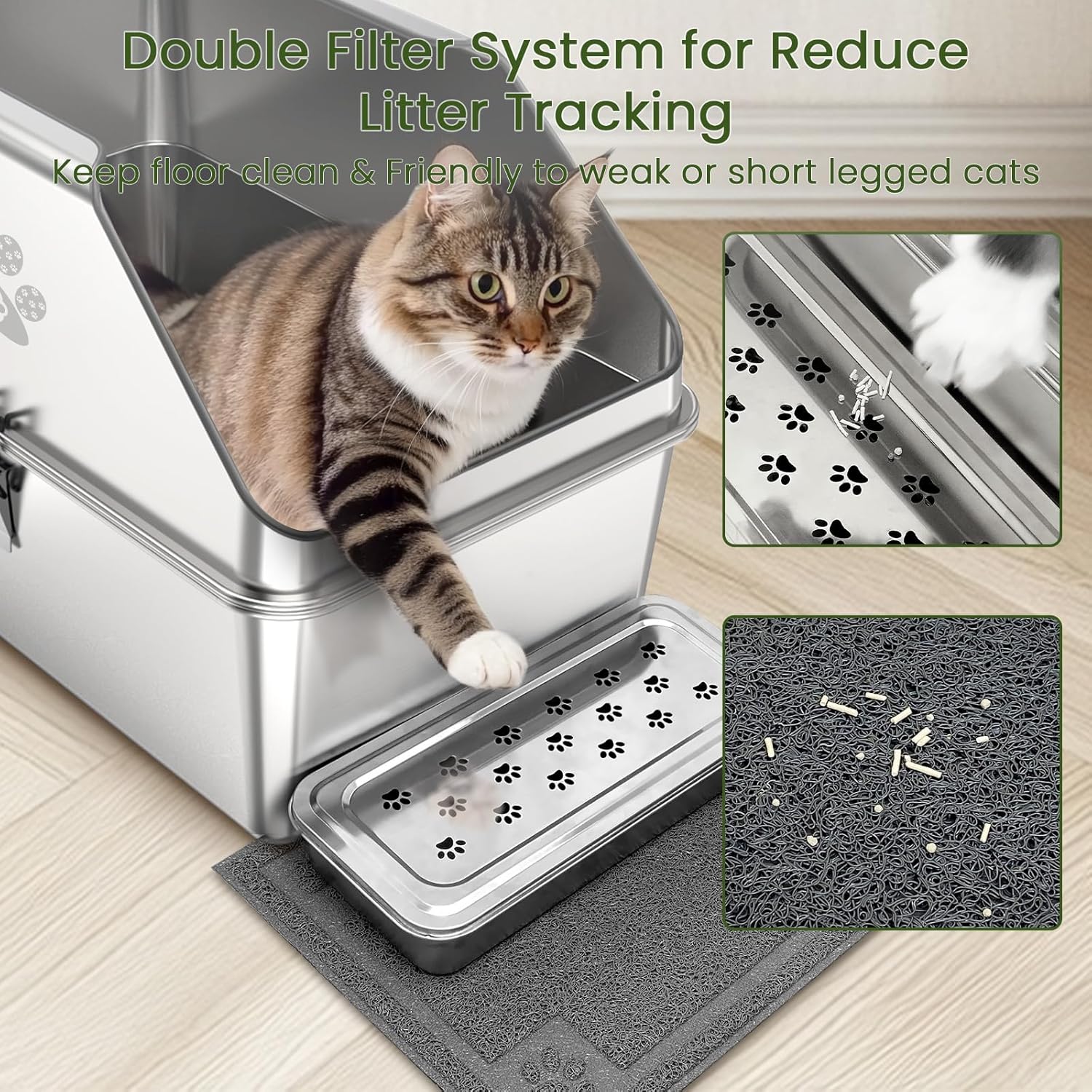 Diseño de filtro de pedal alto de metal completo: la caja de arena cerrada de acero inoxidable con tapa cuenta con un pedal de metal elevado, resistente y duradero. Caja de arena abierta diseñada para entrar y salir fácilmente para gatos mayores, gatitos y gatos de patas cortas. La textura antideslizante del pedal de metal agarra eficazmente la arena para gatos en las garras del gato, evitando que la arena se extienda por el suelo, manteniendo tu hogar limpio.