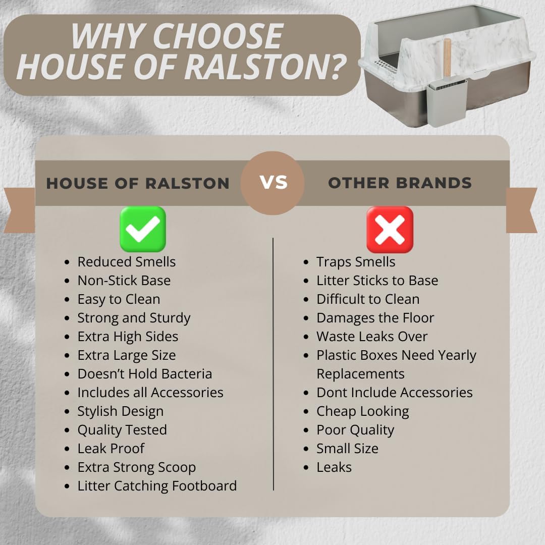 Lados altos: menos desorden, menos seguimiento: nuestra caja de arena para gatos de lados altos evita la dispersión de la arena, manteniendo los suelos limpios. La caja de arena grande con lados altos es perfecta para gatos que cavan y patean. Diseñado como una caja de arena de acero inoxidable extra grande con cubierta para gatos grandes y hogares de varios gatos.