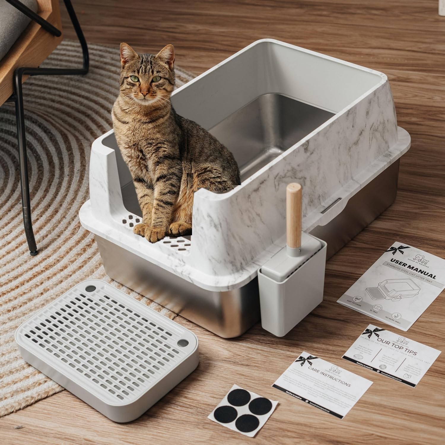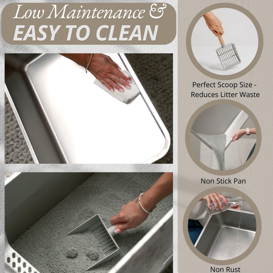 No más olor – Antiadherente y fácil de limpiar: di adiós a los olores con nuestra caja de arena de acero inoxidable con tapa. A diferencia de las cajas de arena de plástico para gatos, esta caja de arena de acero evita la acumulación de orina y el olor. La caja de arena para gatos con control de olores mantiene tu hogar fresco con un mínimo esfuerzo de limpieza.