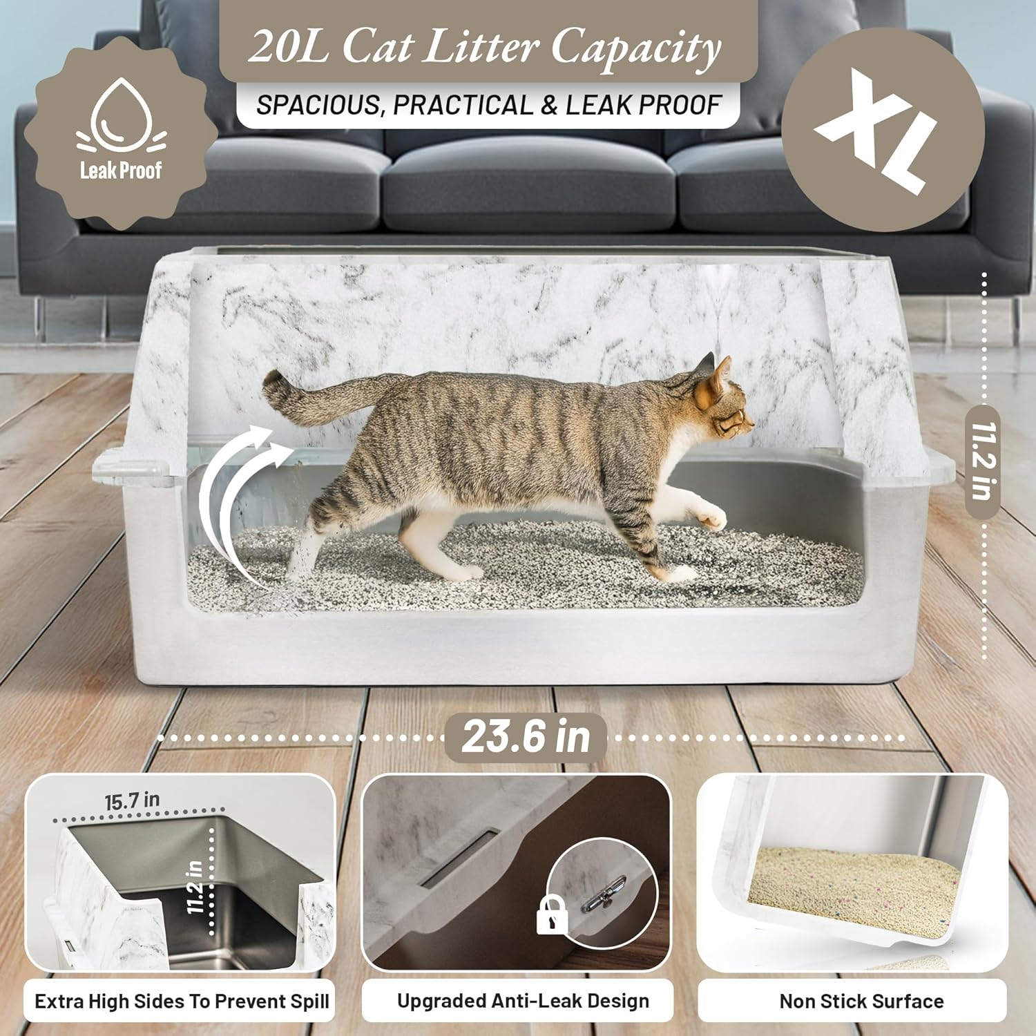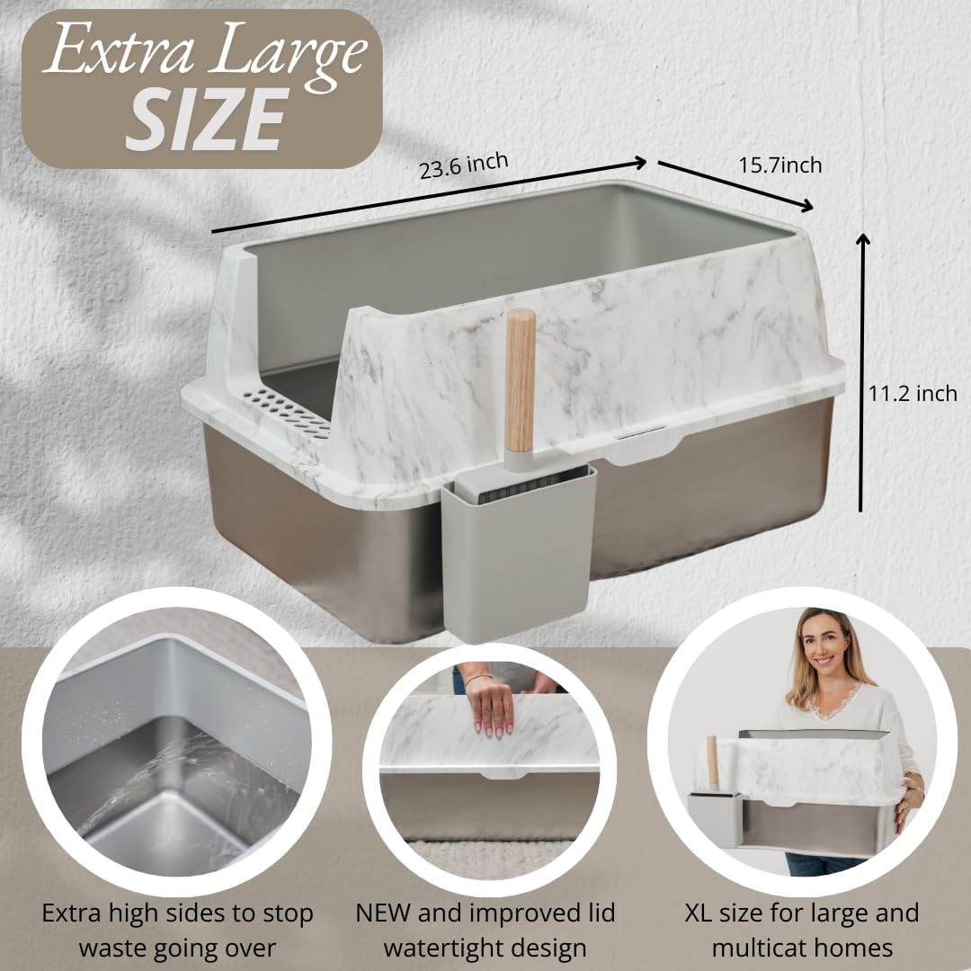 Caja de arena de acero inoxidable con diseño de mármol de lujo, sin olor: ¡mejora tu caja de arena de acero inoxidable para gatos! A diferencia de las cajas de arena de plástico, esta caja de arena de metal resiste manchas, olores y fugas. Una gran caja de arena de acero inoxidable que es pura, duradera e ideal para hogares con varios gatos.
