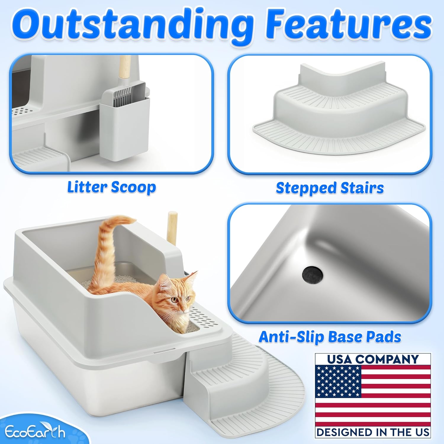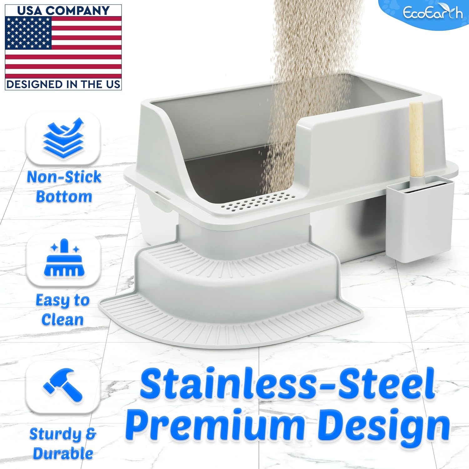 Juego todo incluido: incluye 1 bandeja de arena de acero inoxidable, 1 recinto de ABS, 1 escalera escalonada, 1 cuchara, 1 soporte para cucharas, 4 almohadillas antideslizantes y 1 manual de instrucciones fácil de seguir (idioma español no garantizado)
