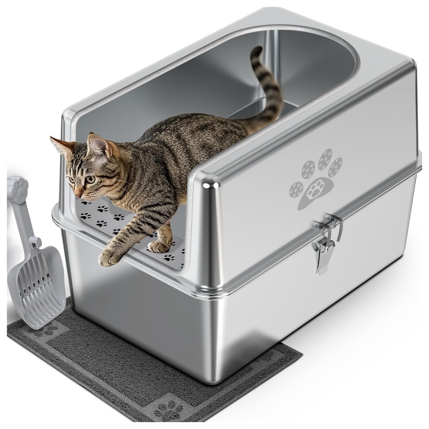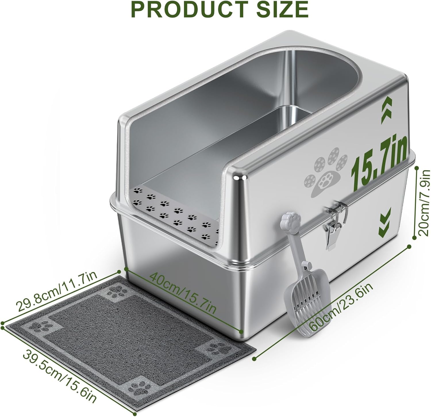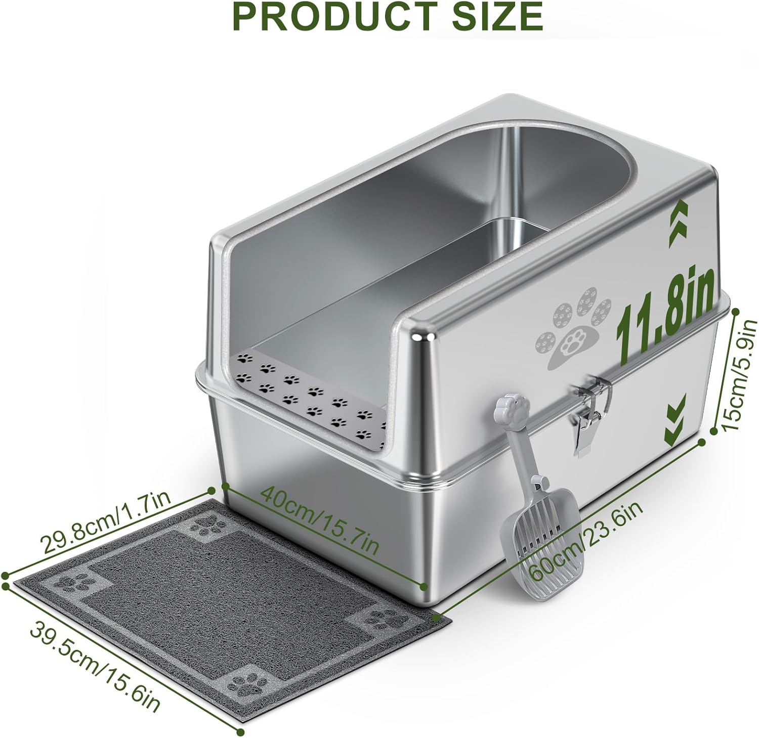 Arenero Abierto con Borde de Acero Inoxidable para Gatos + Alfombra y Pala