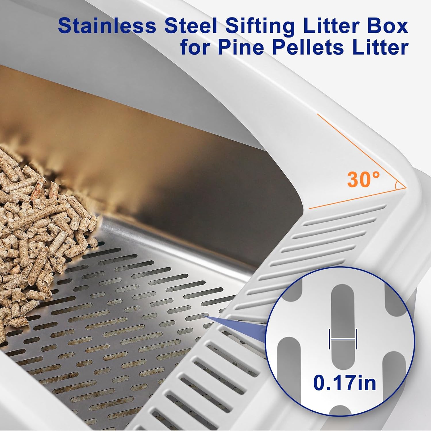 Diseño a prueba de fugas para uso intensivo: La caja de arena para gatos con tapa superior está diseñada para minimizar la dispersión de arena y brindar un espacio privado para sus mascotas. Fabricada en acero inoxidable de alta calidad, es fácil de mantener y resistente a la oxidación. (Protector contra salpicaduras desmontable de 15 cm). Nuestra caja de arena tamizadora para pellets de pino ofrece estabilidad incluso para gatos de más de 11 kg.
