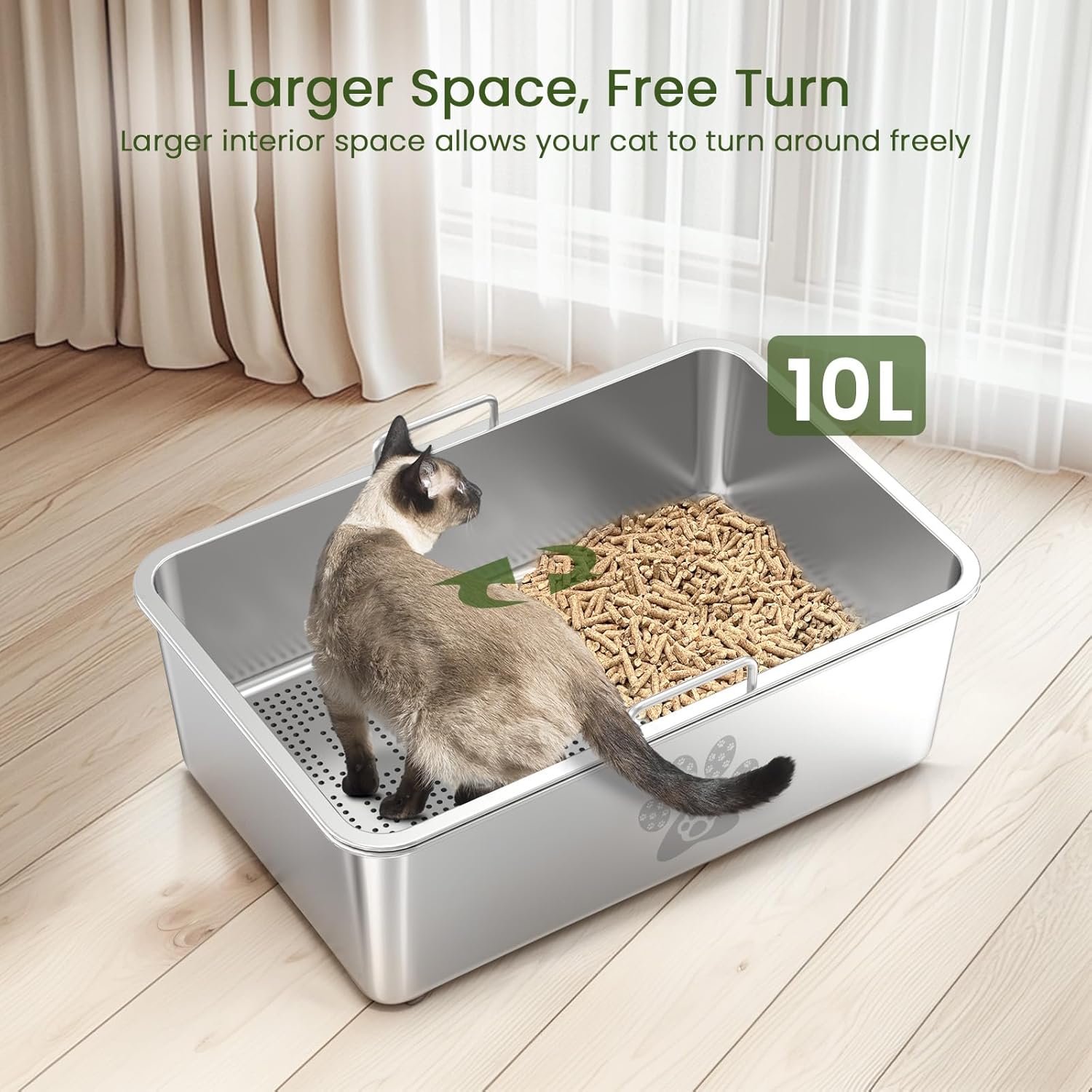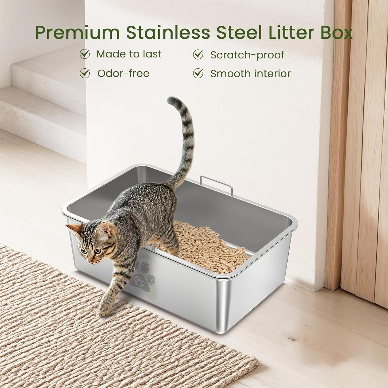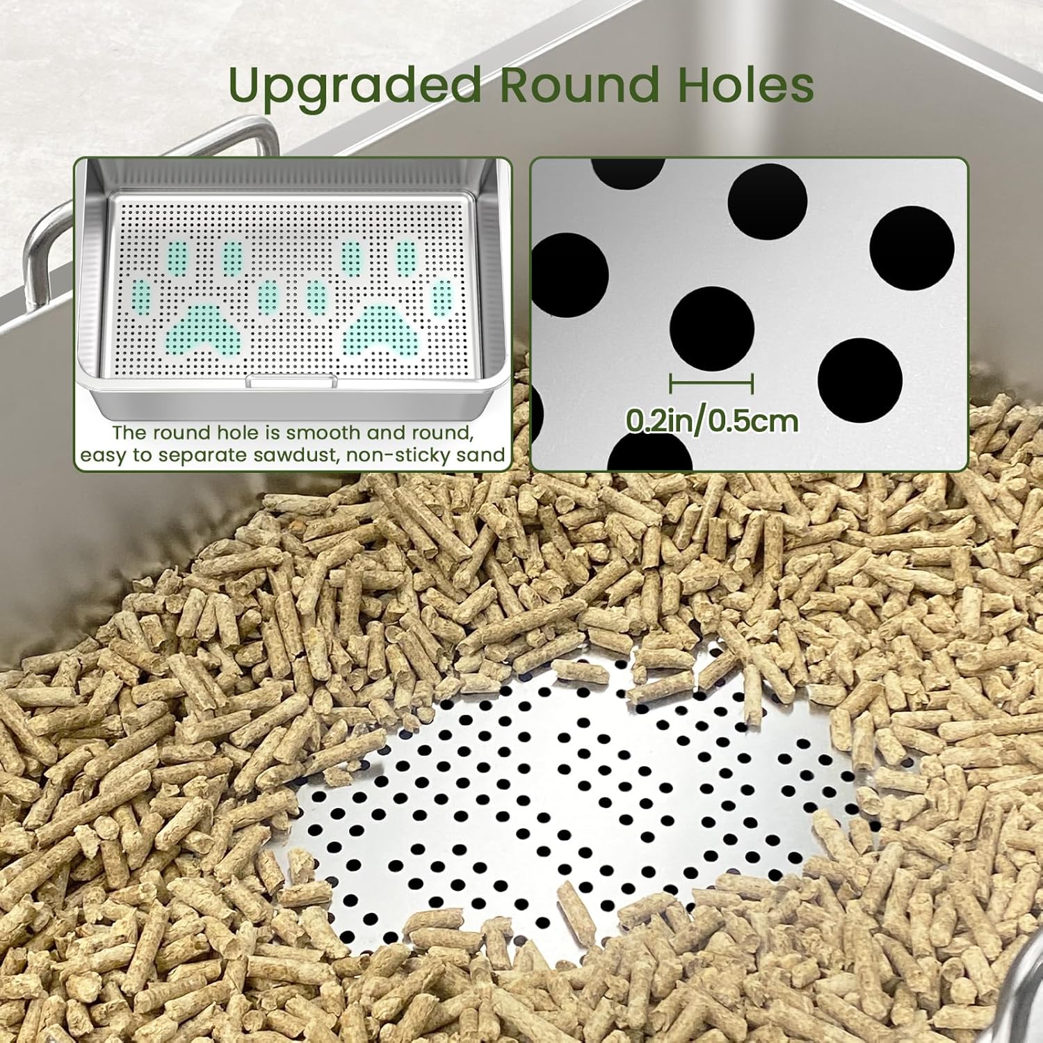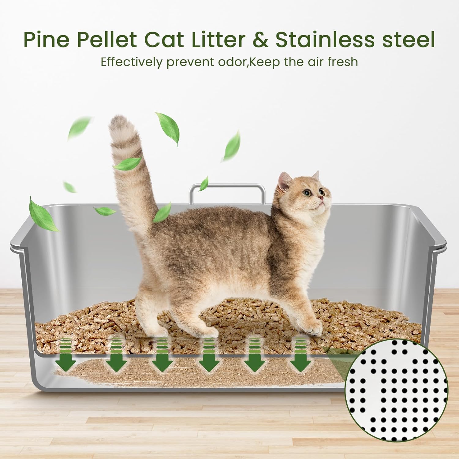 Control superior de olores: Fabricada en acero inoxidable 304 de alta calidad, esta caja de arena con tamiz es resistente a arañazos y mordeduras, lo que garantiza una larga durabilidad y un ambiente sin olores. La combinación de la caja de arena de acero inoxidable con tamiz y pellets de pino proporciona doble protección contra los olores, manteniendo su hogar fresco y agradable.