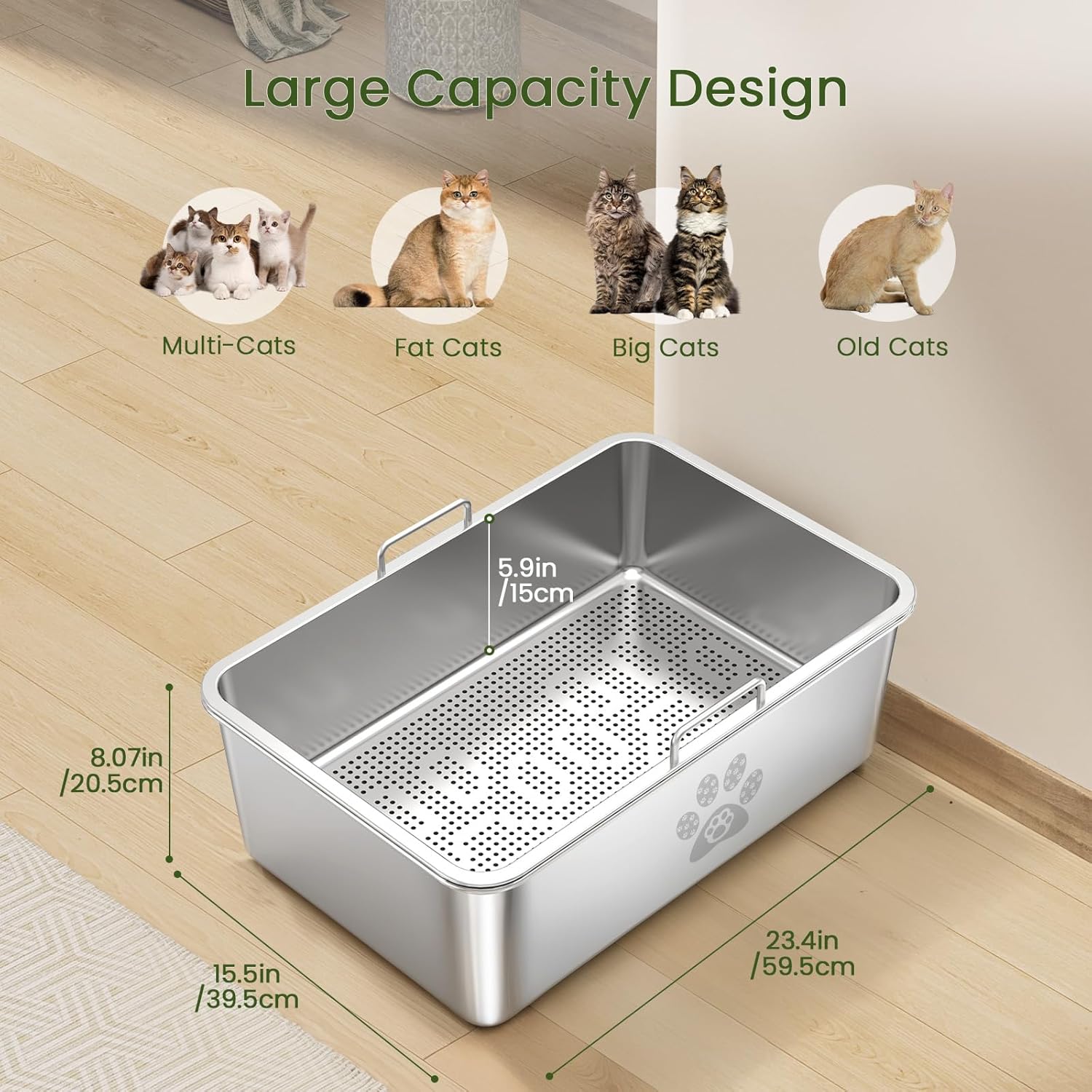 Asa de acero inoxidable, fácil de limpiar: Este tamiz de acero inoxidable evita que el aserrín se derrame durante la limpieza, a diferencia de las cajas de arena de plástico con cajón. Las asas laterales de acero inoxidable mejoradas facilitan la extracción y la eliminación de los desechos de la bandeja inferior, facilitando así la limpieza.
