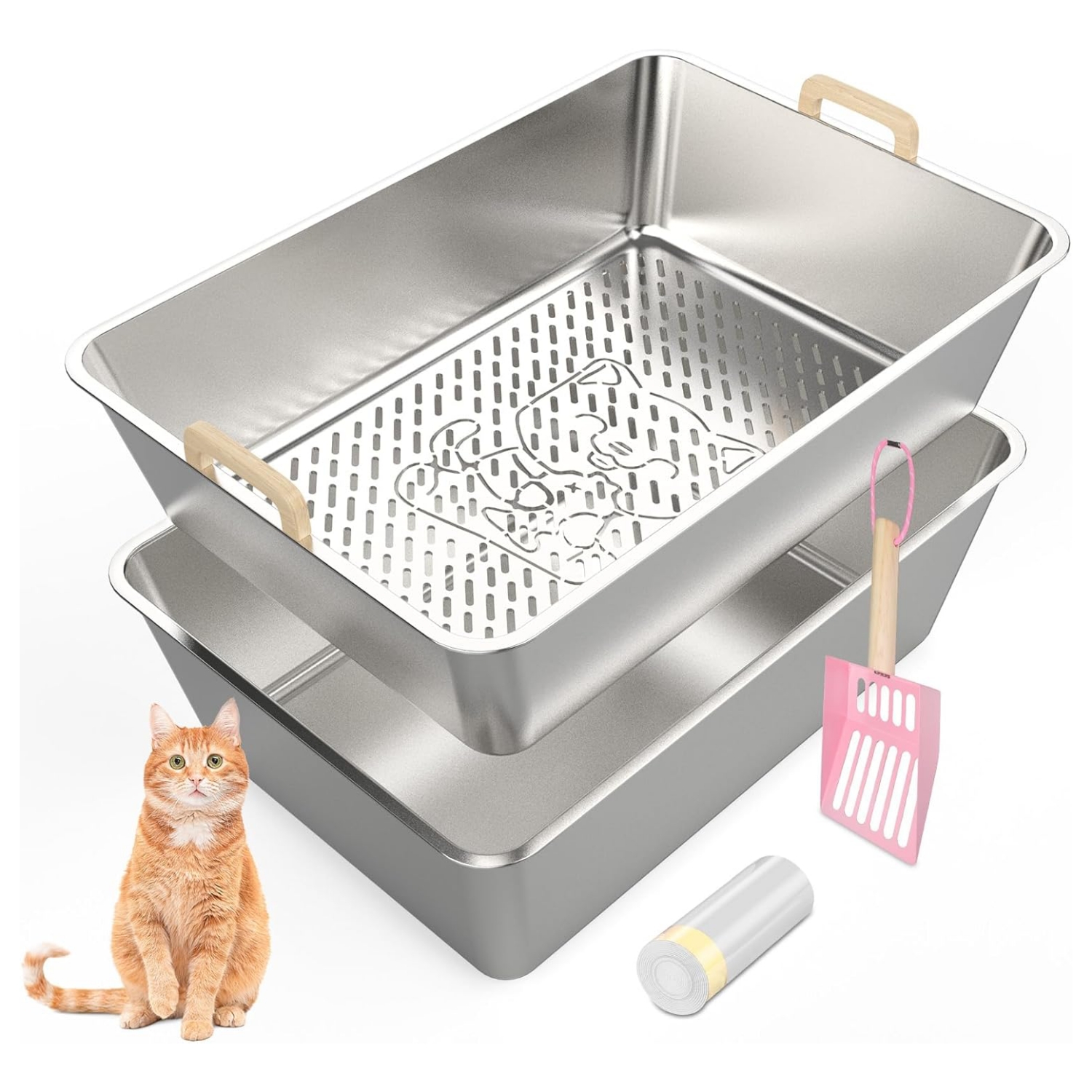 Arenero Abierto de Acero Inoxidable con Bandeja Tamiz para Gatos 59x40x20 Cm