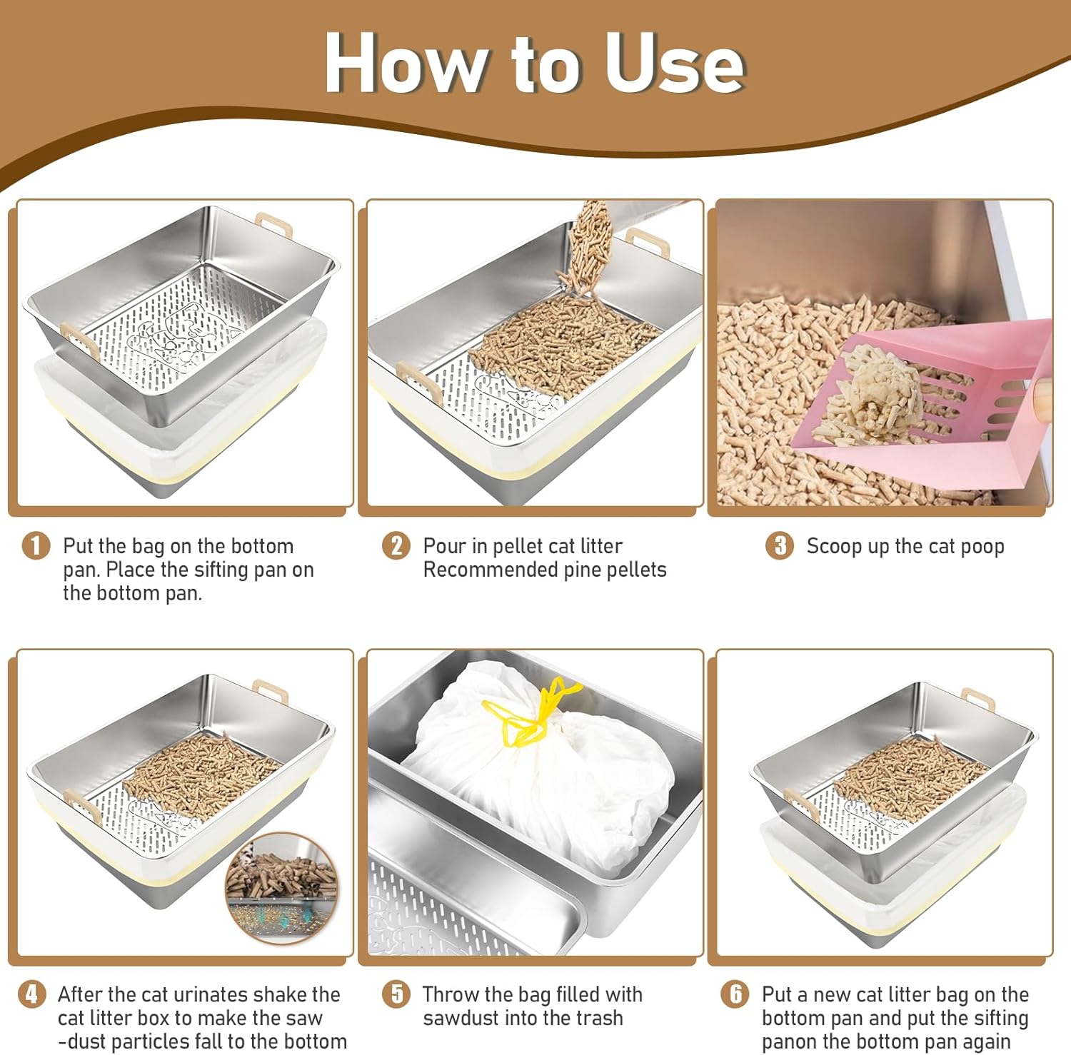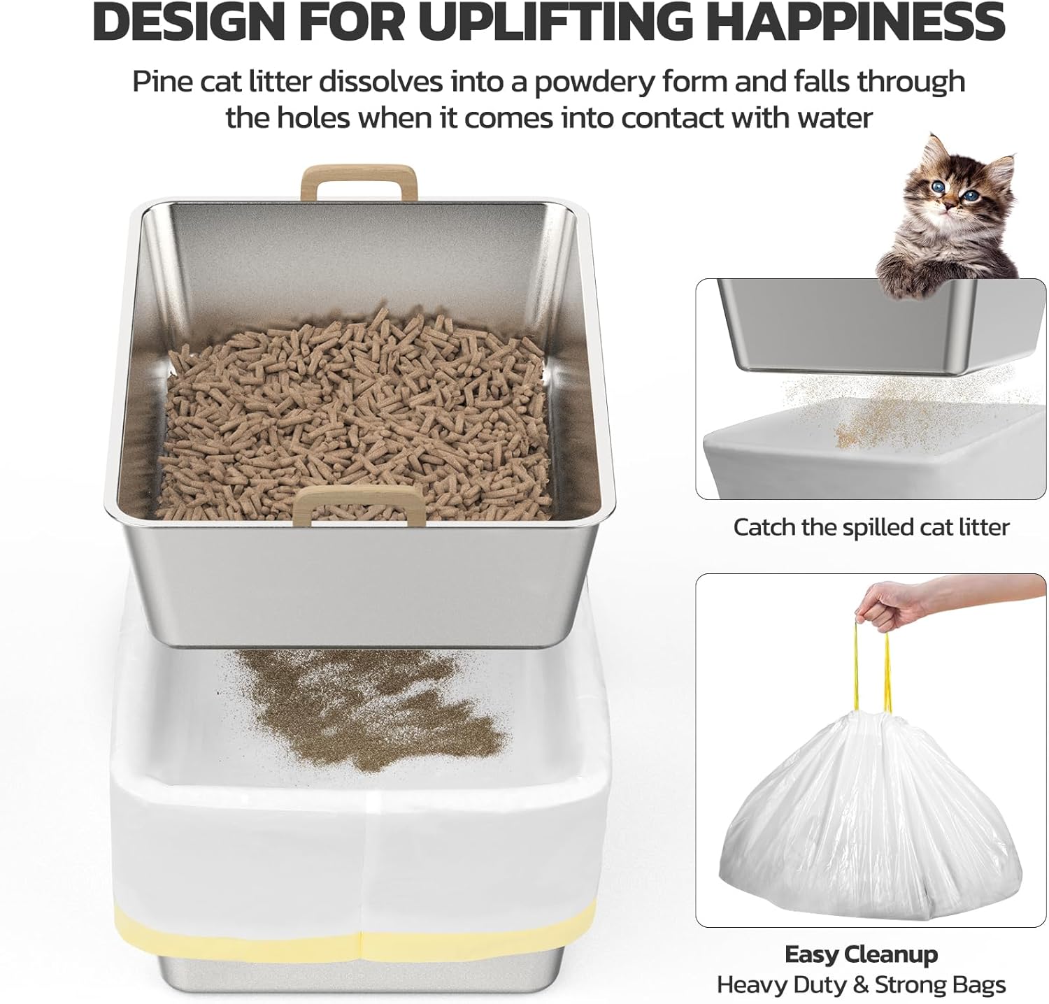 Solución premium para desodorización: las bolitas de pino absorben la orina y se transforman en aserrín, lo que proporciona un control excepcional de olores para un ambiente más fresco. La caja de arena para gatos de acero inoxidable no absorbe olores ni manchas desagradables, y es fácil de limpiar. El acero inoxidable ofrece doble protección para el control de olores.