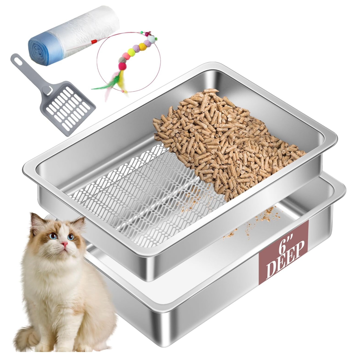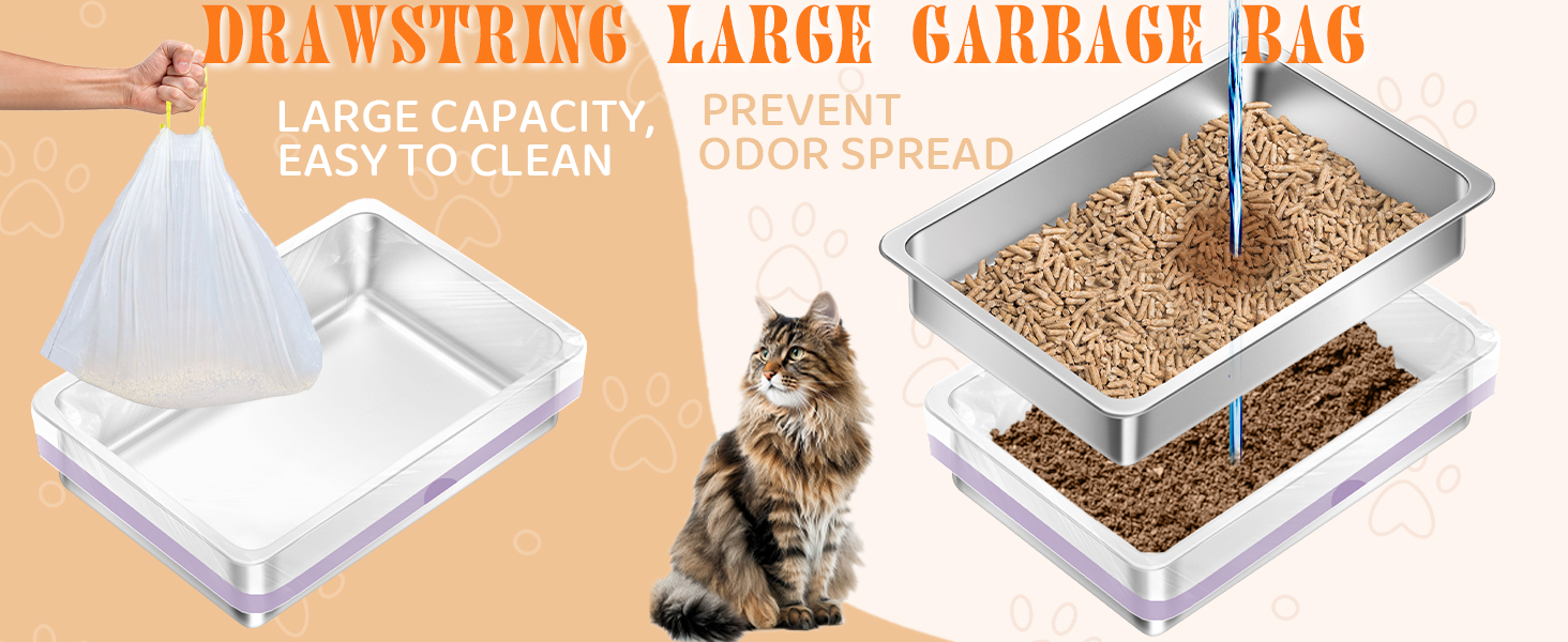 Kit completo para el manejo de la arena: Incluye una caja de acero inoxidable con tamiz, juguetes interactivos para gatos, pala, almohadillas antideslizantes y bolsas para la caja de arena. Adhiera las almohadillas a la base para un uso sin vibraciones. Las bolsas de arena de alta capacidad contienen más de 7 días de desechos; simplemente retírelas cuando estén llenas.