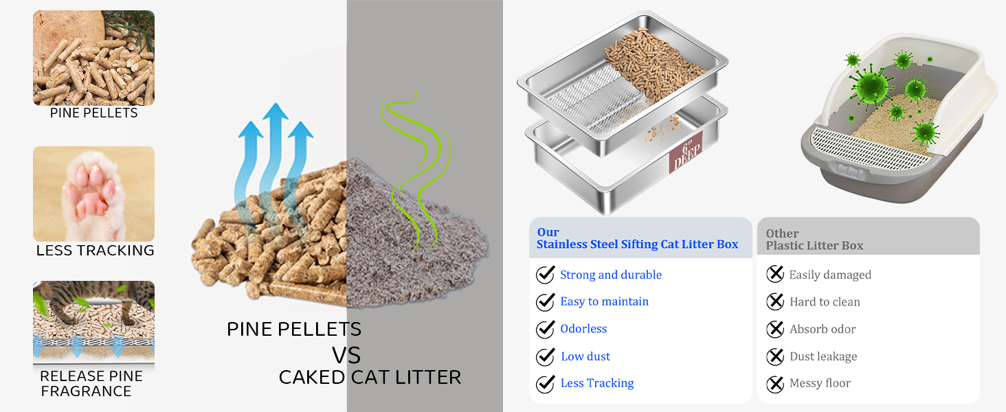 Caja de arena con tamiz de doble capa para arena antiaglomerante: Diseñada específicamente para arena para gatos de pellets de pino, arenas a base de madera y otras fórmulas antiaglomerantes. La bandeja de tamiz curva de acero inoxidable separa eficazmente los pellets limpios de los residuos descompuestos, dirigiendo los residuos hacia el revestimiento hermético inferior. El borde antidispersión evita que los gatos arrastren la arena fuera de la caja. Ideal para dueños de mascotas que buscan soluciones sin olores y de bajo mantenimiento.