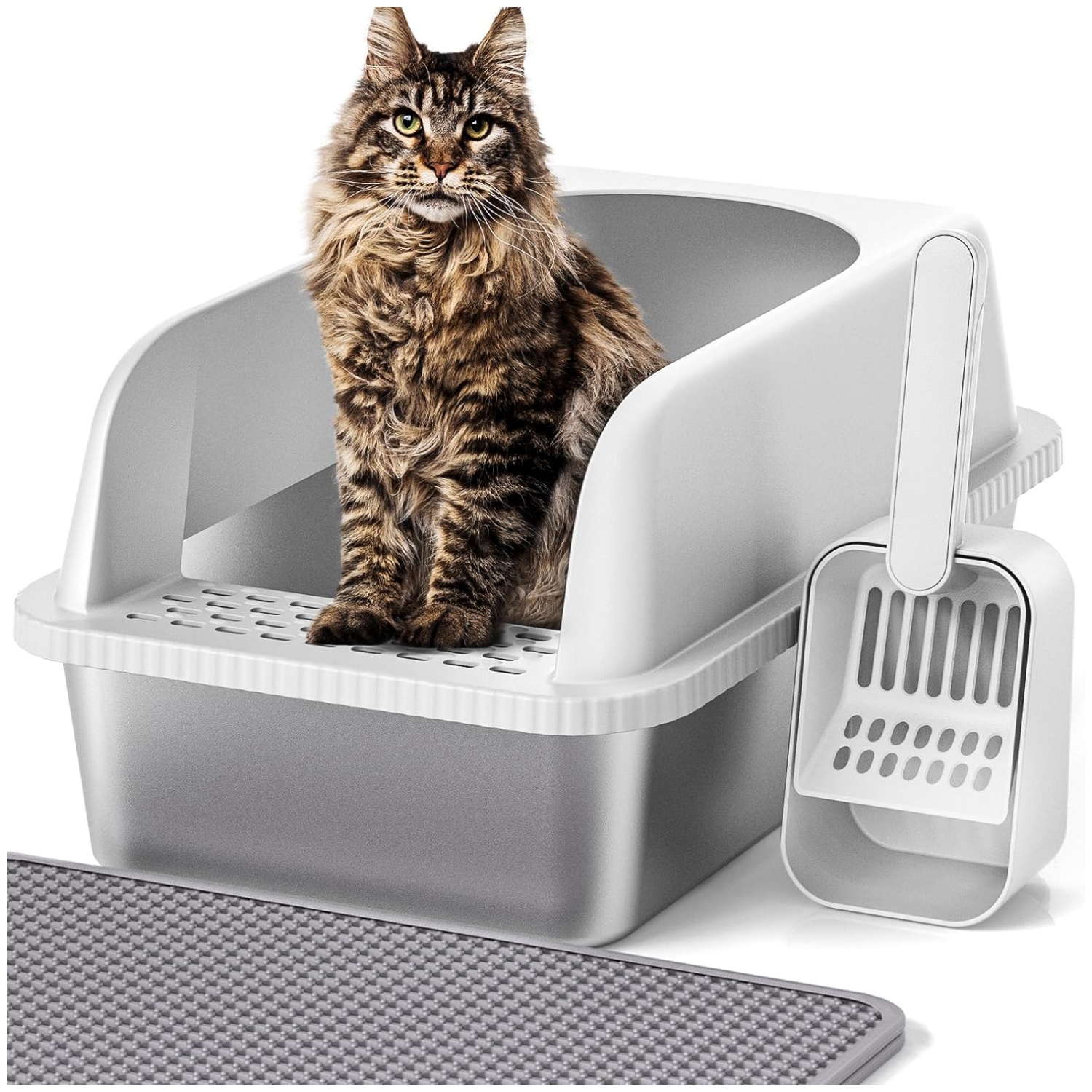 Construcción de acero inoxidable resistente: construida con ABS cerrado de alta pared y acero inoxidable grueso para mayor durabilidad, la caja de arena de acero inoxidable está diseñada para soportar el uso diario y arañazos de patas de gato. La característica de naturaleza no porosa de la caja de arena de acero inoxidable también evita que los olores persistan y prolongan la vida útil