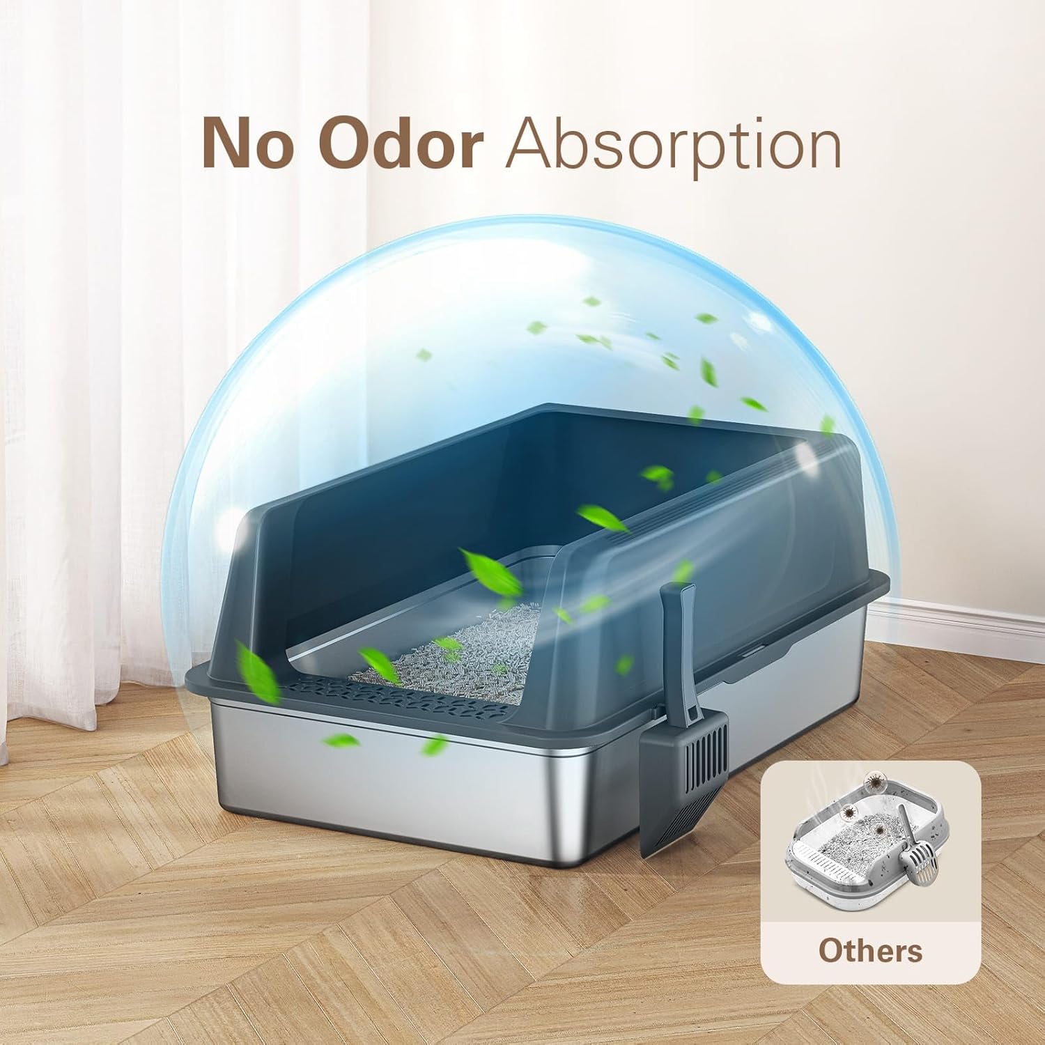 Fácil limpieza para espacios sin olor : la superficie antiadherente de la caja de arena con tapa hace que la limpieza sea un pedazo de pastel, ya que los desechos se deslizan sin esfuerzo con un rápido enjuague de agua. A diferencia de la caja de arena de plástico, la caja de acero inoxidable XXL no absorbe manchas ni olores, manteniendo un ambiente fresco e higiénico para tu gato