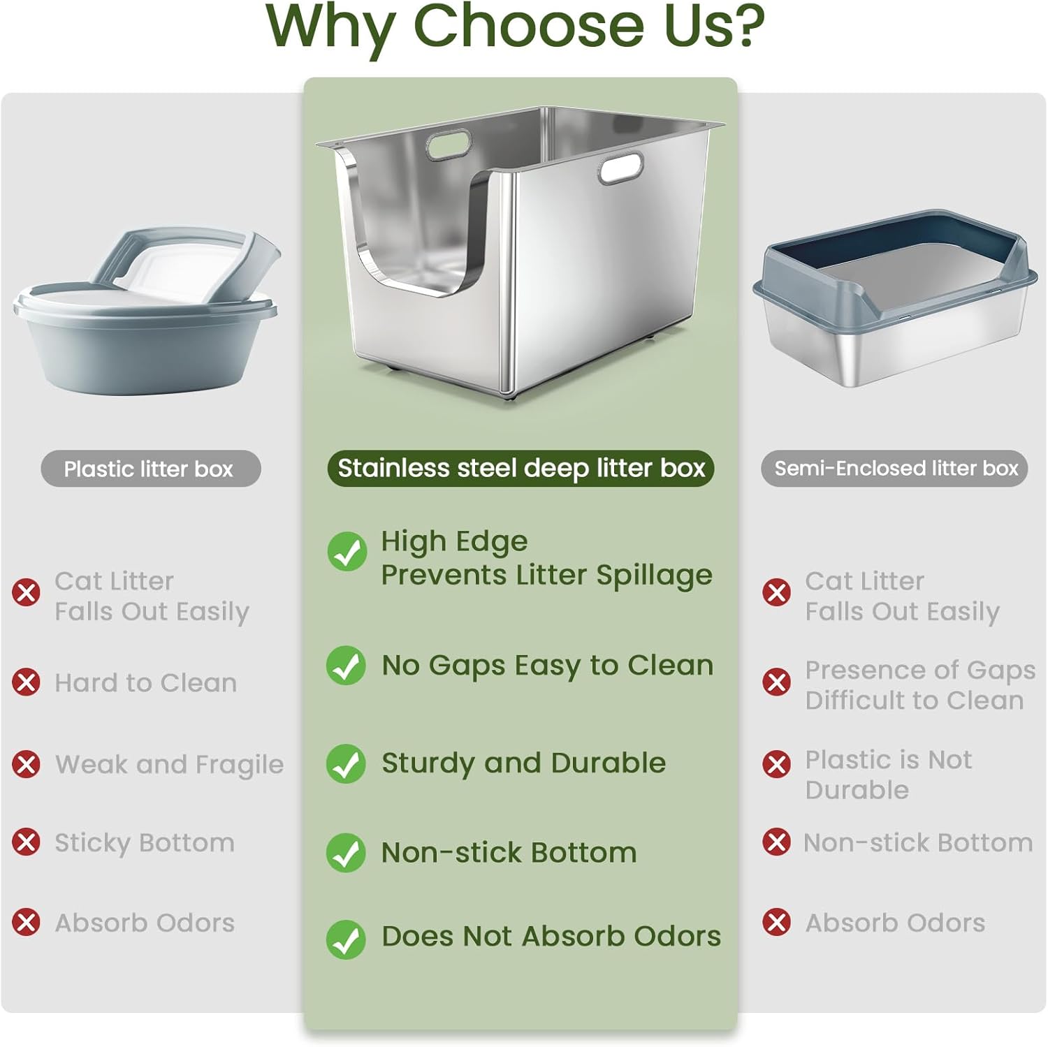 Caja de arena de metal: hecha de acero inoxidable completo, resistente al óxido, sin olor y antiadherente, esta caja de arena de lados altos cuenta con un diseño de caja de arena profunda de 13.8 pulgadas de alto que evita que los gatos salgan de la caja para gatos. La caja de arena para gatos de acero inoxidable de una sola pieza grande para gatos grandes evita eficazmente que la orina del gato se filtre y es amigable para gatos que orinan alto