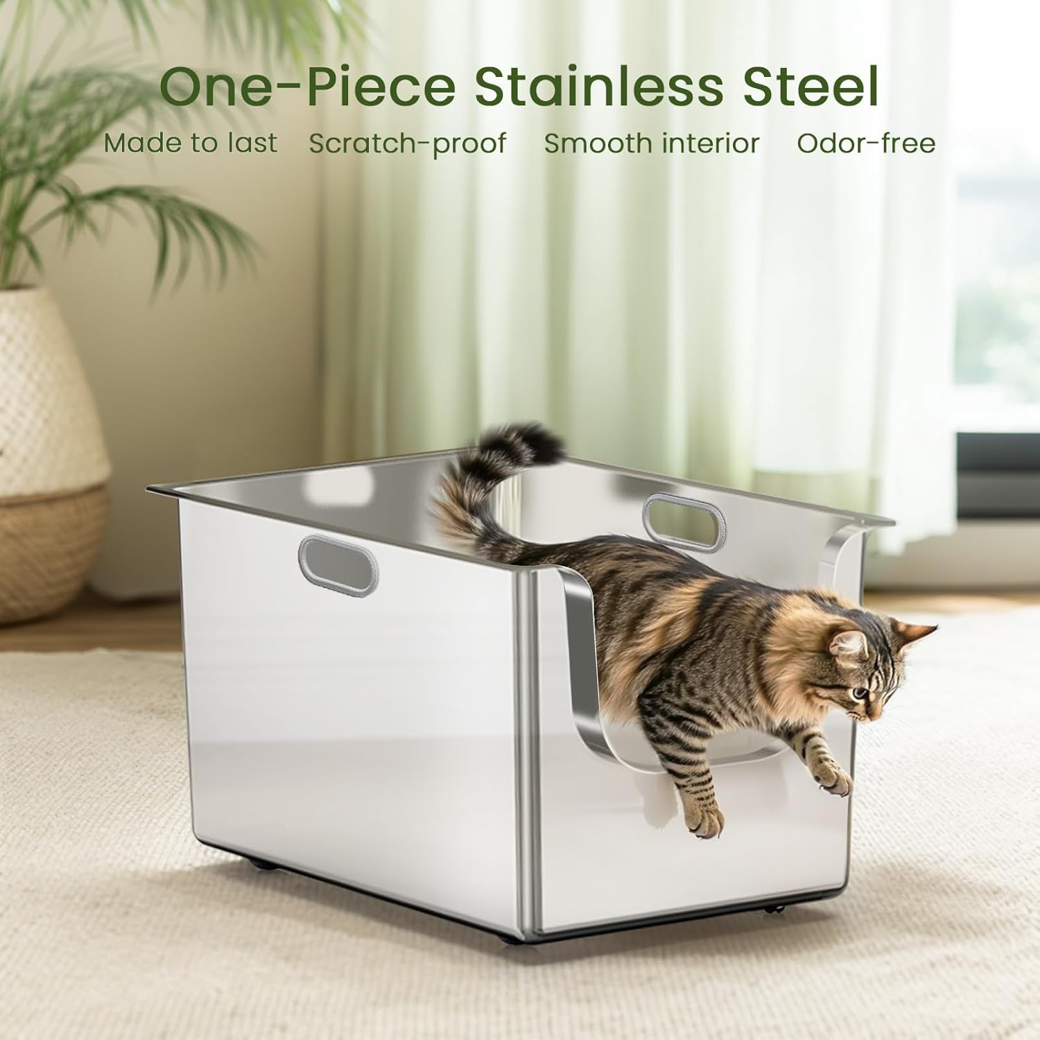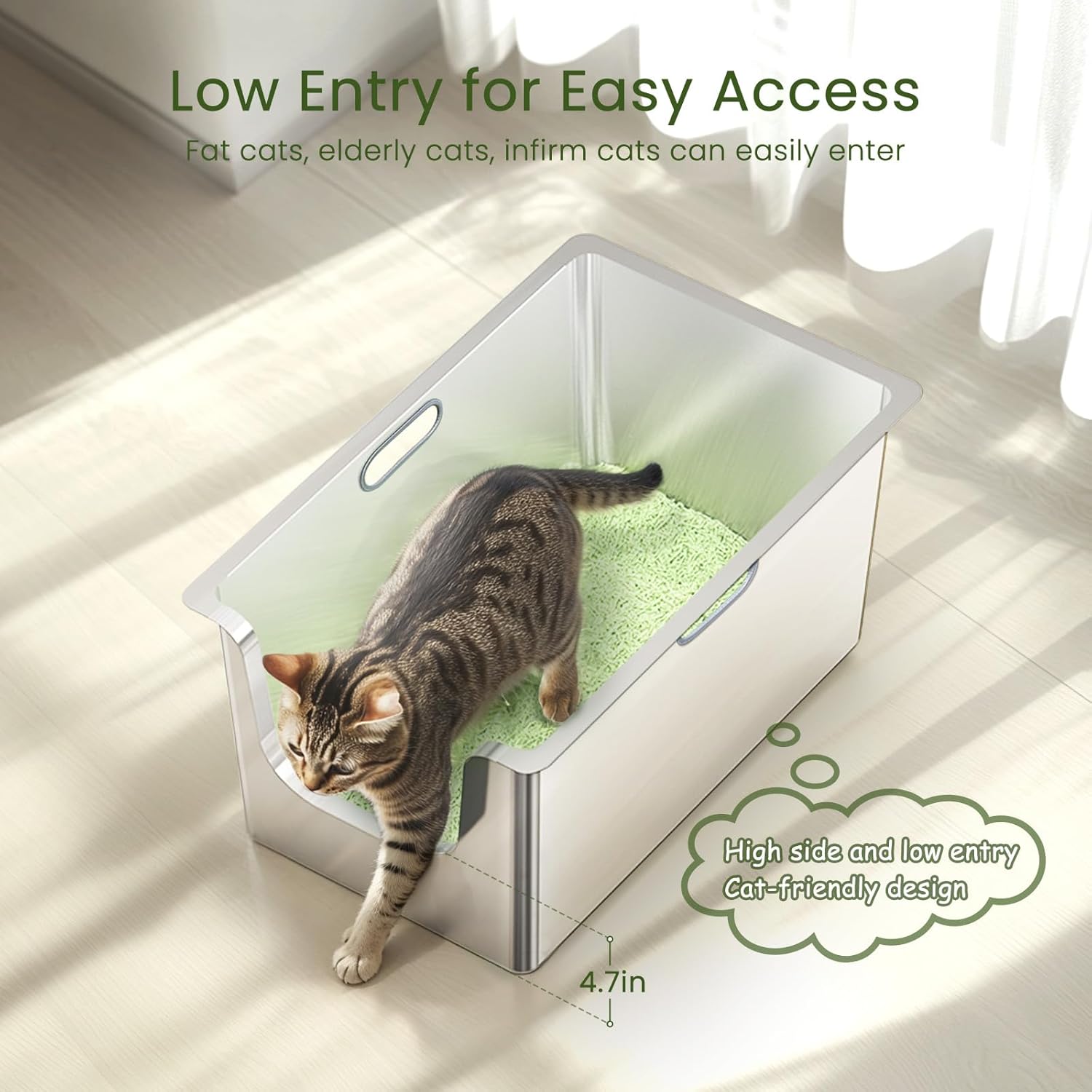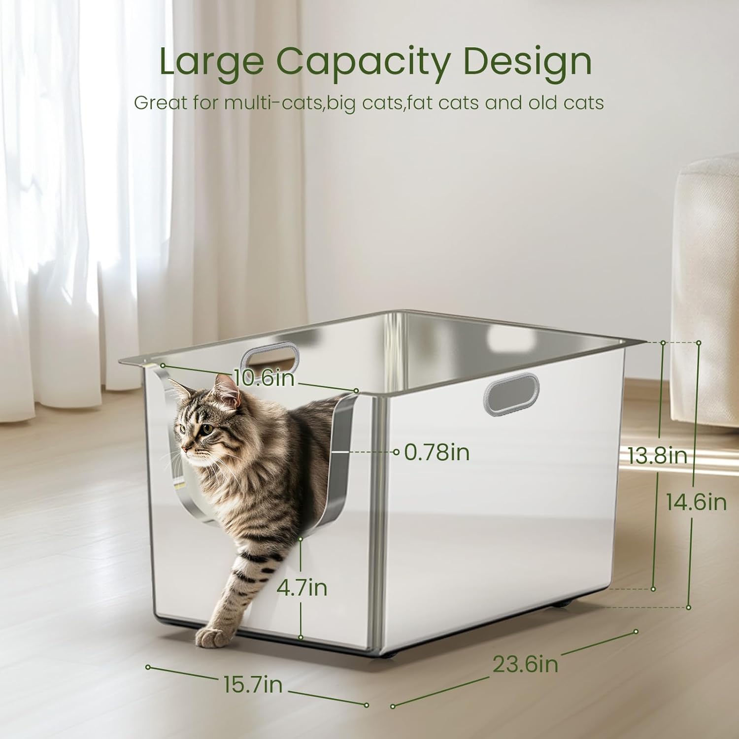 Caja de arena XXL de acero inoxidable: El tamaño extra grande de 23.7 “* 15.8 “* 14.8” permite que los gatos se den la vuelta por dentro. Es ideal para hogares con varios gatos y espacio lo suficientemente grande para gatos, conejos, hámsters y otras mascotas, proporcionando tranquilidad para ti. La entrada baja curvada está diseñada para un fácil acceso por los gatitos que aprenden a ir al baño, gatos ancianos, gatos gordos y gatos enfermos