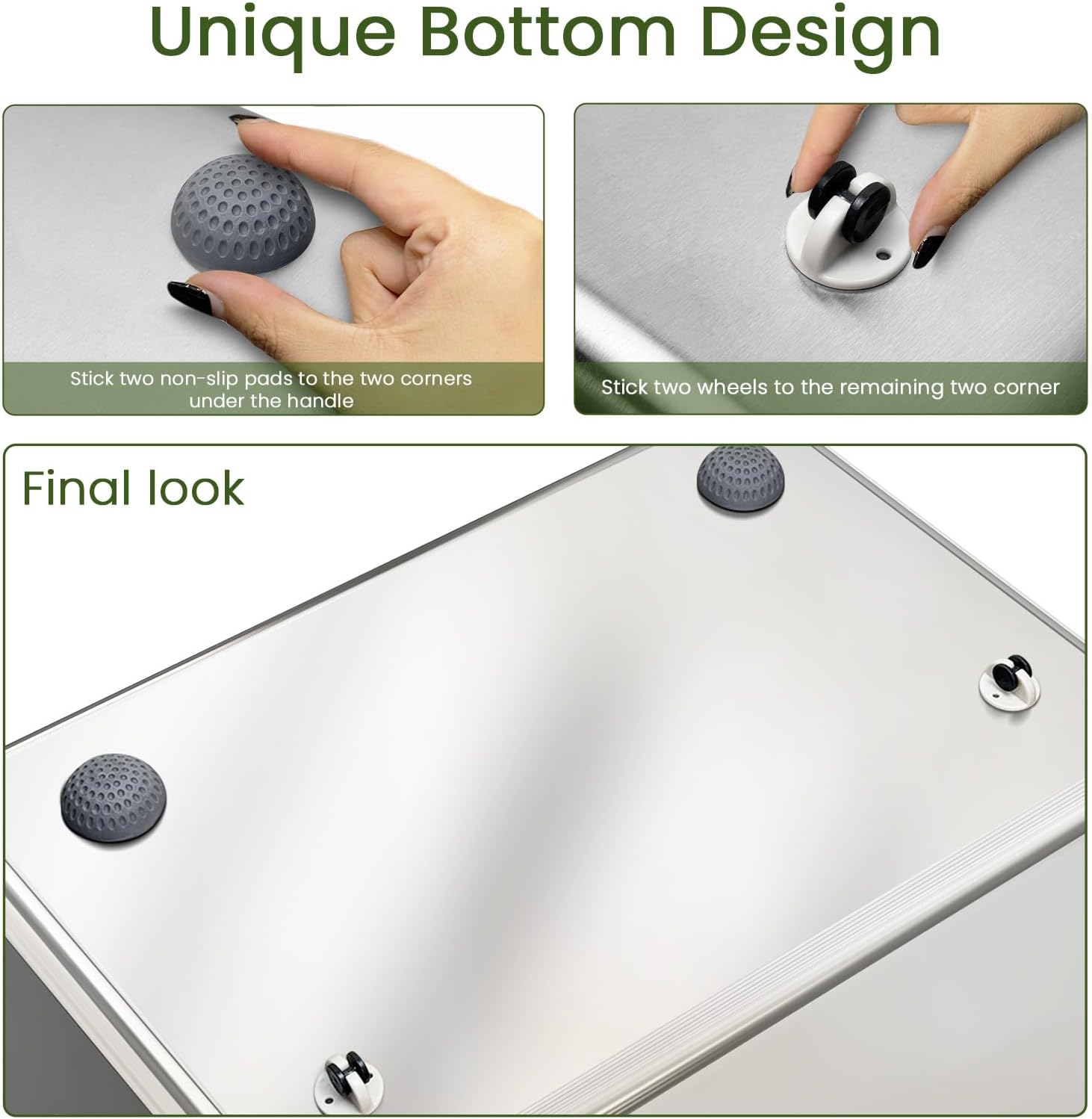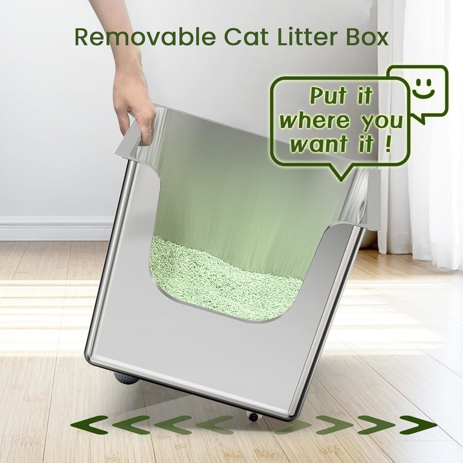 Manijas convenientemente móviles y fáciles de levantar: mueve tu bandeja de arena para gatos con facilidad, gracias a las asas portátiles recubiertas de goma en ambos lados proporcionan un agarre cómodo. Las ruedas deslizantes hacen que el movimiento sea fácil. Además, la almohadilla antideslizante incluida garantiza que la caja de arena de acero inoxidable se mantenga firmemente en su lugar, proporcionando estabilidad y comodidad para tus mascotas