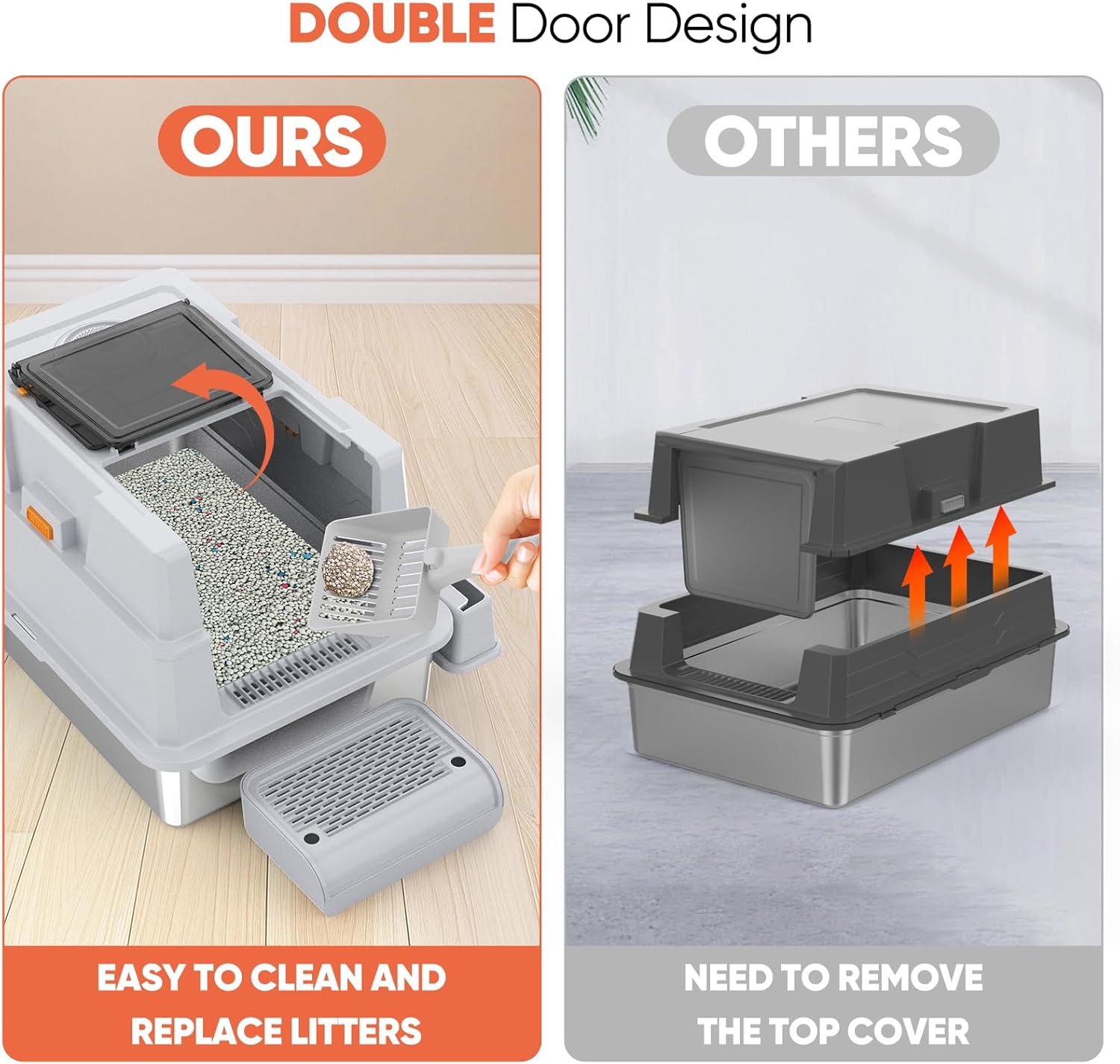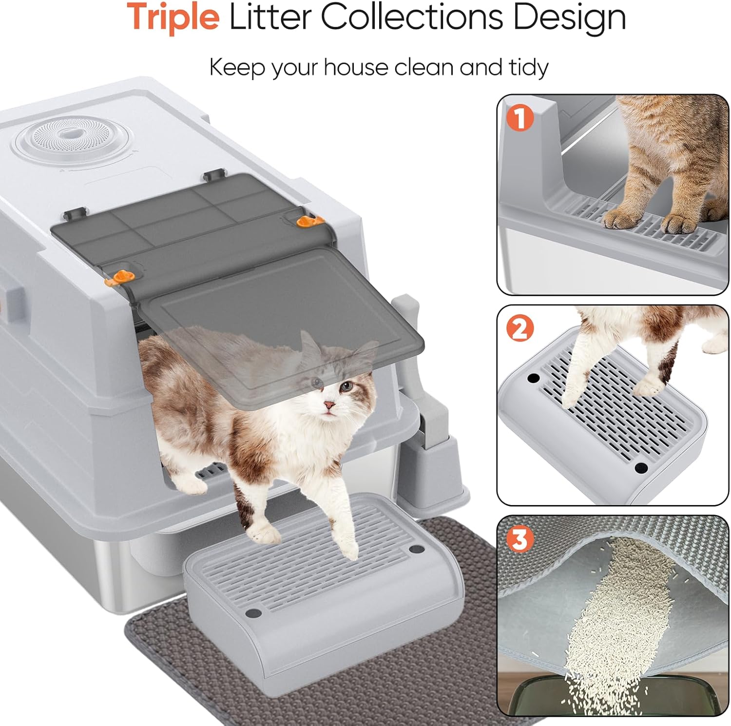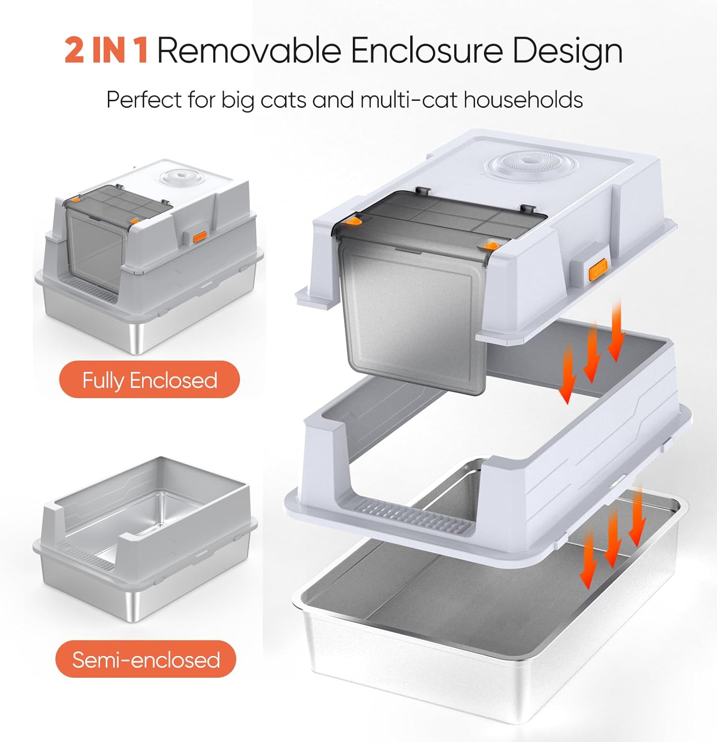 Totalmente cerrada, semicerrada y totalmente abierta: nuestra caja de arena de acero inoxidable para gatos cuenta con una carcasa desmontable de 3 capas fácil de montar que ofrece configuraciones totalmente cerradas y semicerradas y completamente abiertas. El modo completamente cerrado puede evitar la propagación de olores y proteger a tu gato de la interferencia de otras mascotas, mientras que el modo completamente abierto puede promover la ventilación, el semi-cerrado hace que la limpieza sea más conveniente.