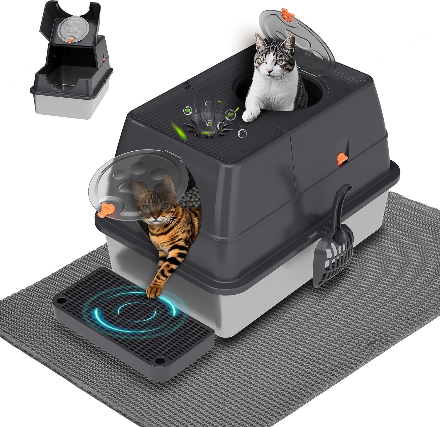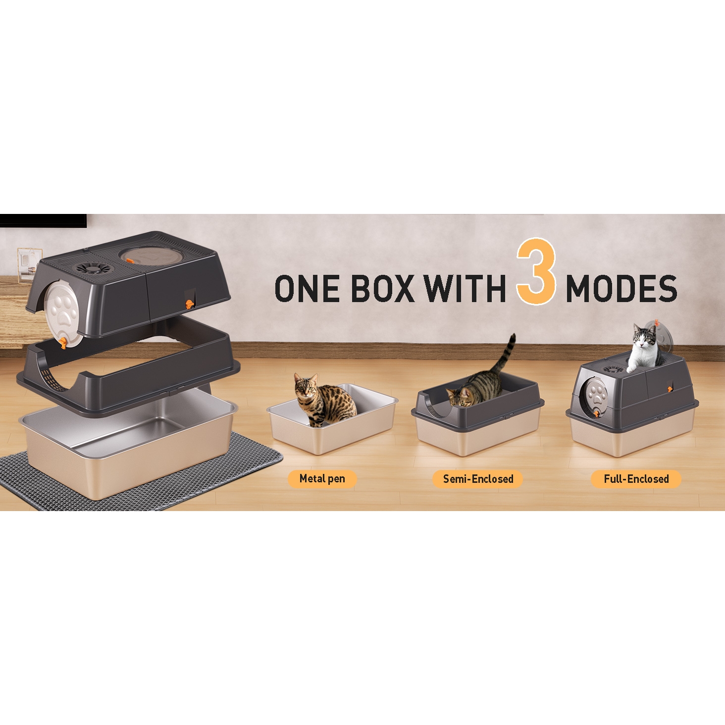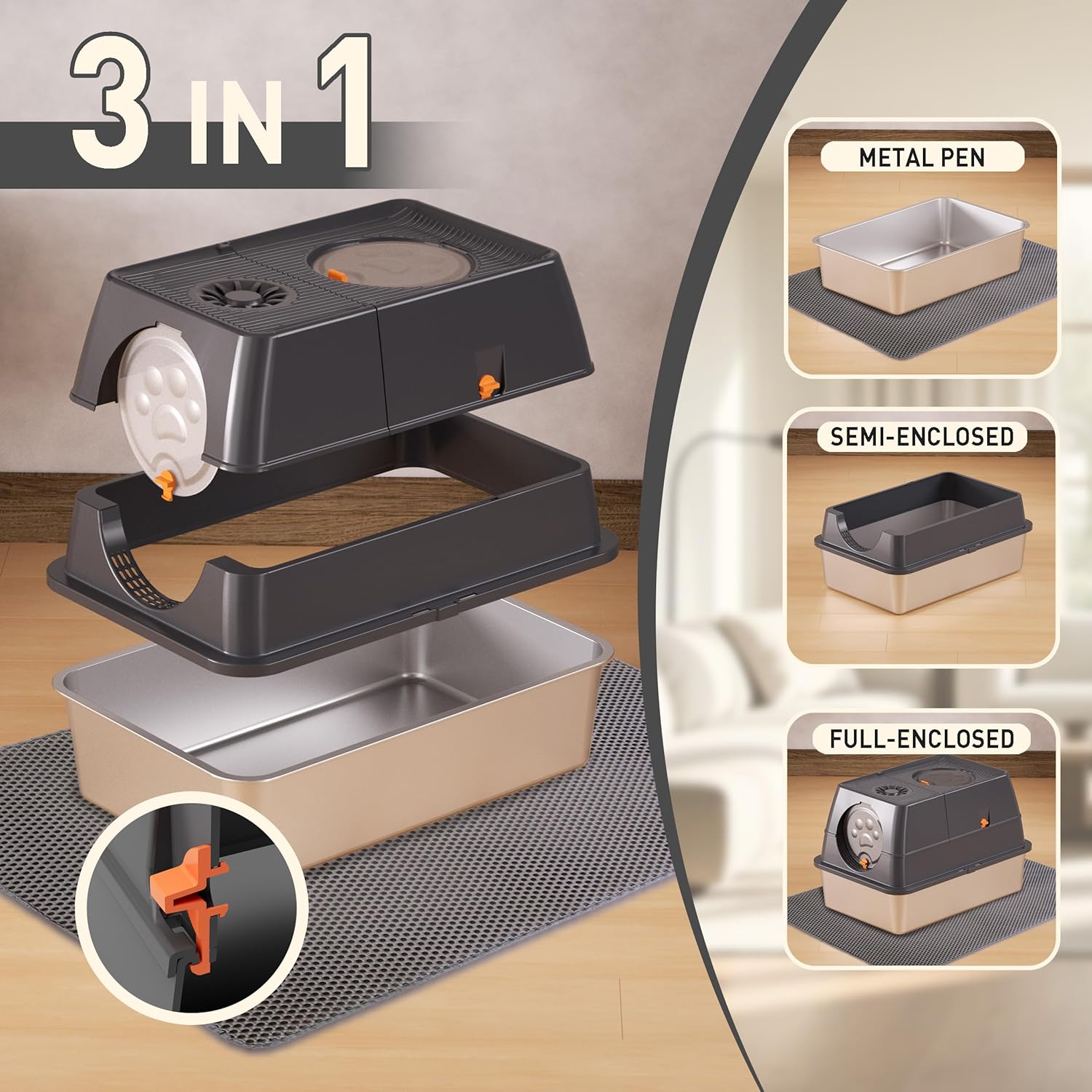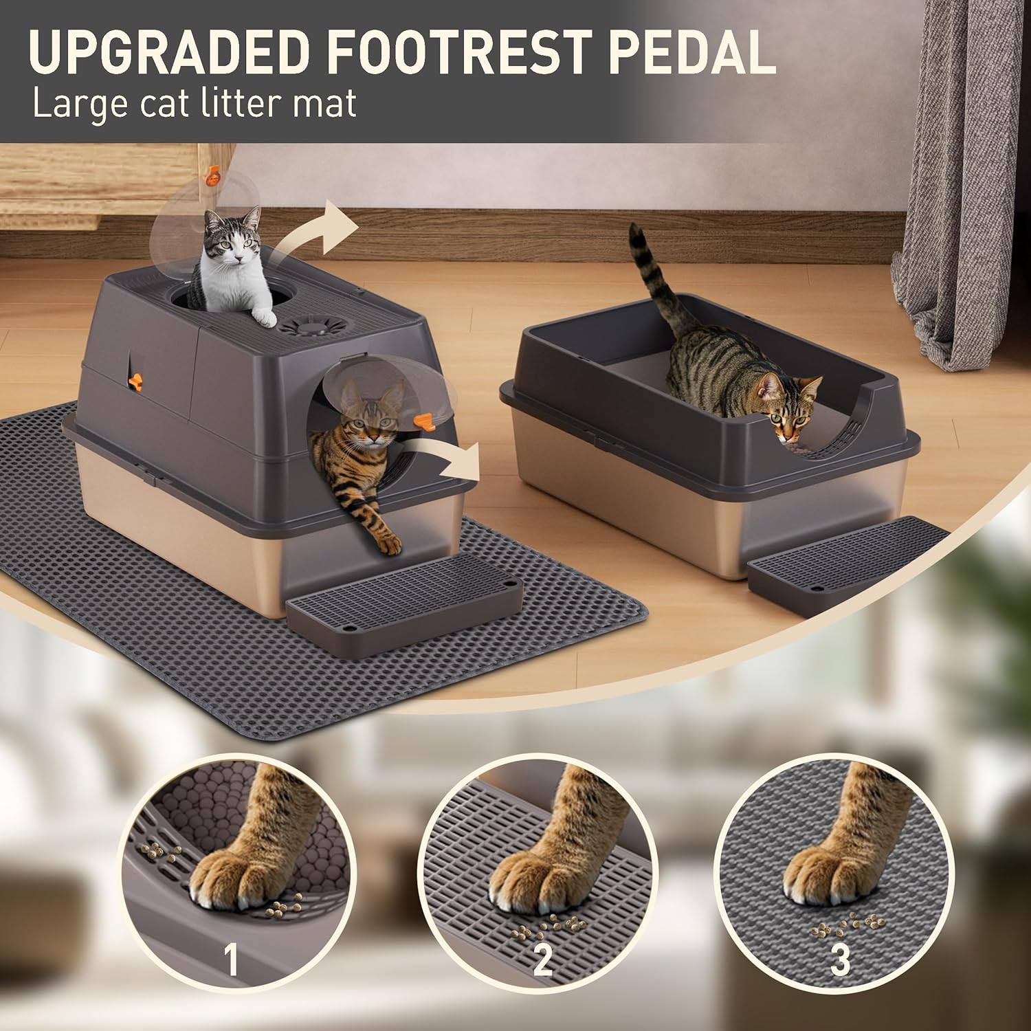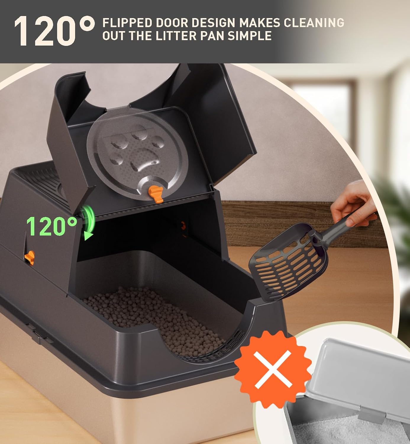 Modo integrado cerrado y de doble entrada: diseñada con un sistema modular fácil de montar, esta caja de arena soporta configuraciones completamente cerradas y semicerradas para satisfacer las necesidades de tu mascota. Los gatos pueden entrar por la puerta principal y salir de la tapa superior, o usar la tapa superior tanto para la entrada como para la salida. Este diseño de doble entrada ayuda a prevenir el rastreo de basura y reduce el desorden, por lo que es una opción conveniente para los dueños de mascotas.