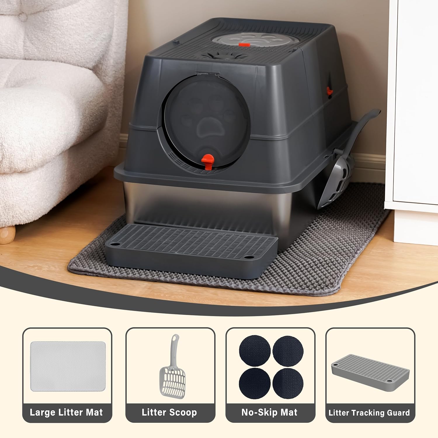 100% acero inoxidable grueso de alta calidad: hecha de acero inoxidable de alta calidad, a prueba de óxido, nuestra caja de arena para gatos está diseñada para resistir arañazos y cuenta con una superficie antiadherente para una limpieza sin esfuerzo. Su estructura duradera es lo suficientemente fuerte como para soportar el peso de un adulto, lo que garantiza una fiabilidad duradera y un rendimiento superior. El diseño incluido incluye filtros de carbono que absorben eficazmente los olores, manteniendo un ambiente fresco y cómodo para tu gato.