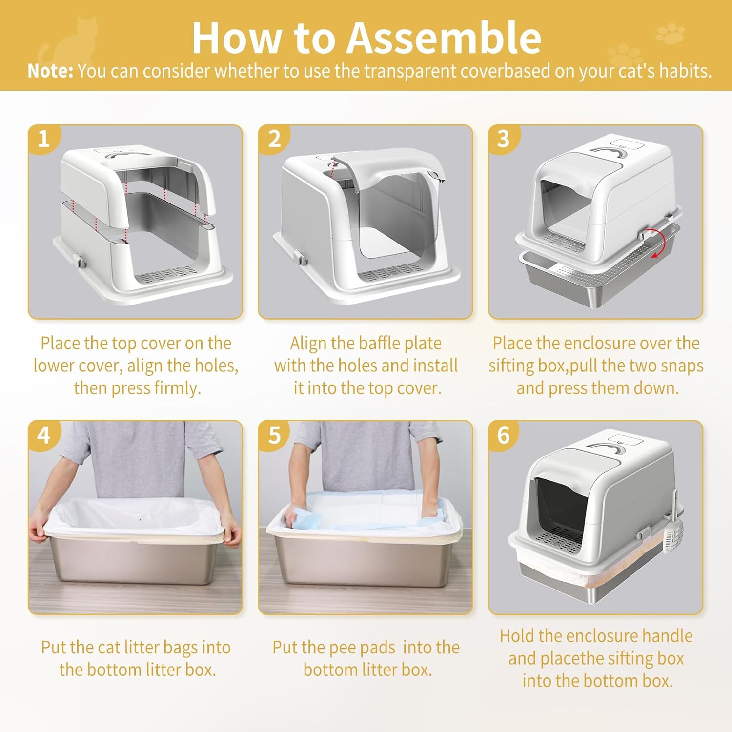 Fácil de instalar y usar El deflector de vidrio transparente en la tapa de nuestra bandeja sanitaria completamente cerrada permite que los gatos entren y salgan a su antojo. Además, el paquete de carbón desodorizante superior incluido absorbe los olores, proporcionando un ambiente fresco y cómodo para tu gato. El manual de instrucciones incluye un video de instalación profesional. Si no sabes cómo instalarlo, sigue las instrucciones del video.