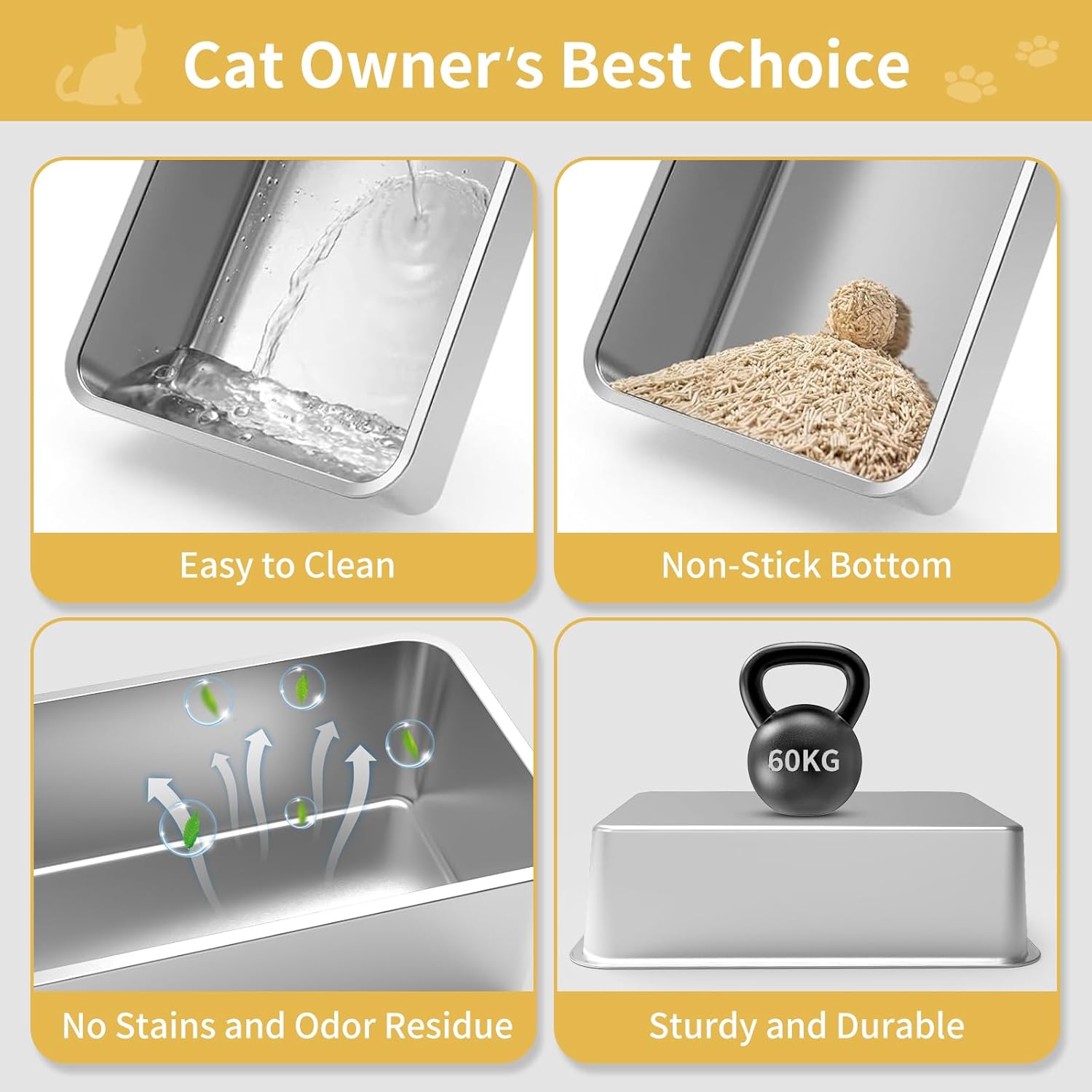 Arena tamizadora de acero inoxidable XL Esta arena para gatos está hecha de acero inoxidable 201 de alta calidad y una tapa de plástico ABS rígido. Mide 60 cm de largo x 40 cm de ancho x 47 cm de alto. Su diseño más grande y profundo es ideal para gatos grandes y varios. Su diseño completamente cerrado aísla eficazmente los olores y su material de acero inoxidable es duradero y fácil de limpiar.