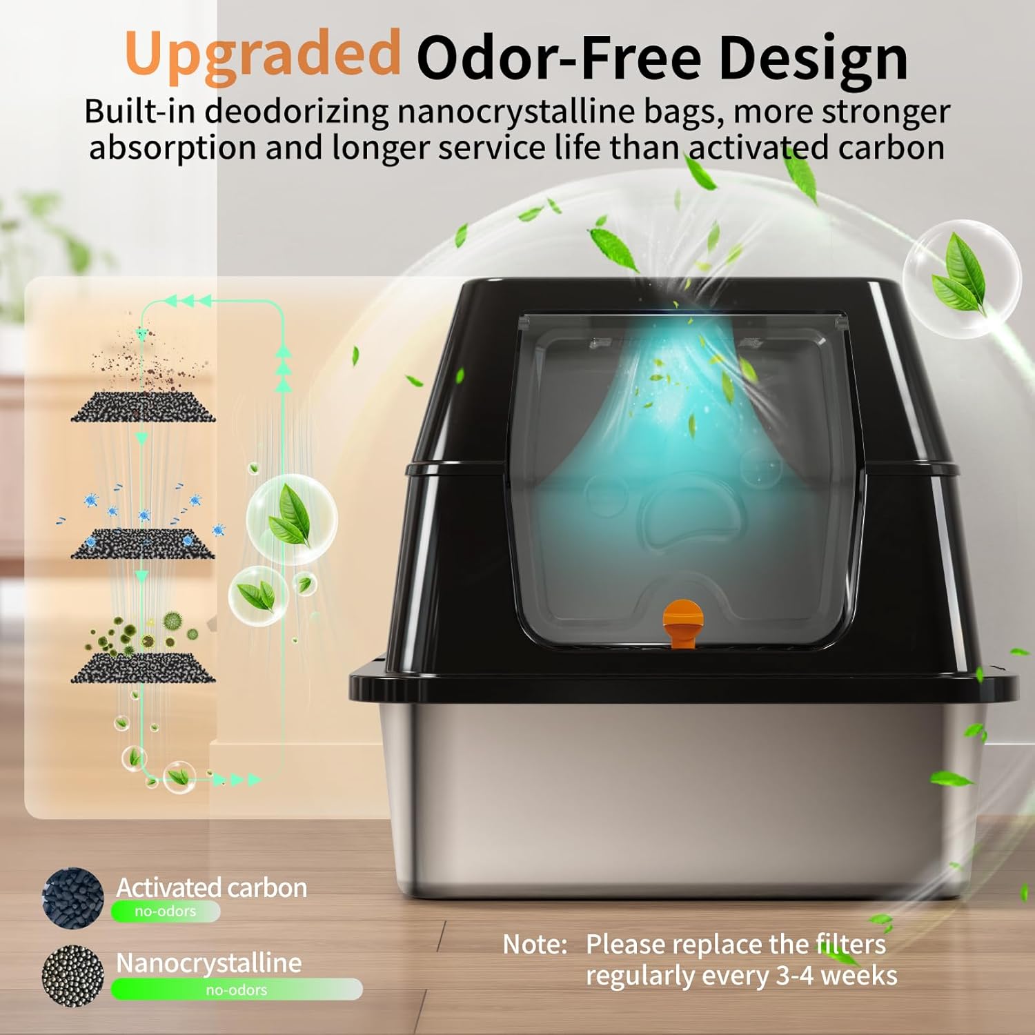 Diseño sin olor mejorado: la caja de arena extra grande cuenta con una caja desodorizante para colocar bolsas nanocristalinas para absorber los olores rápidamente, absorción más fuerte y una vida útil más larga que el carbón activado, asegurando que tu mascota y familia tengan una vida pura y saludable.